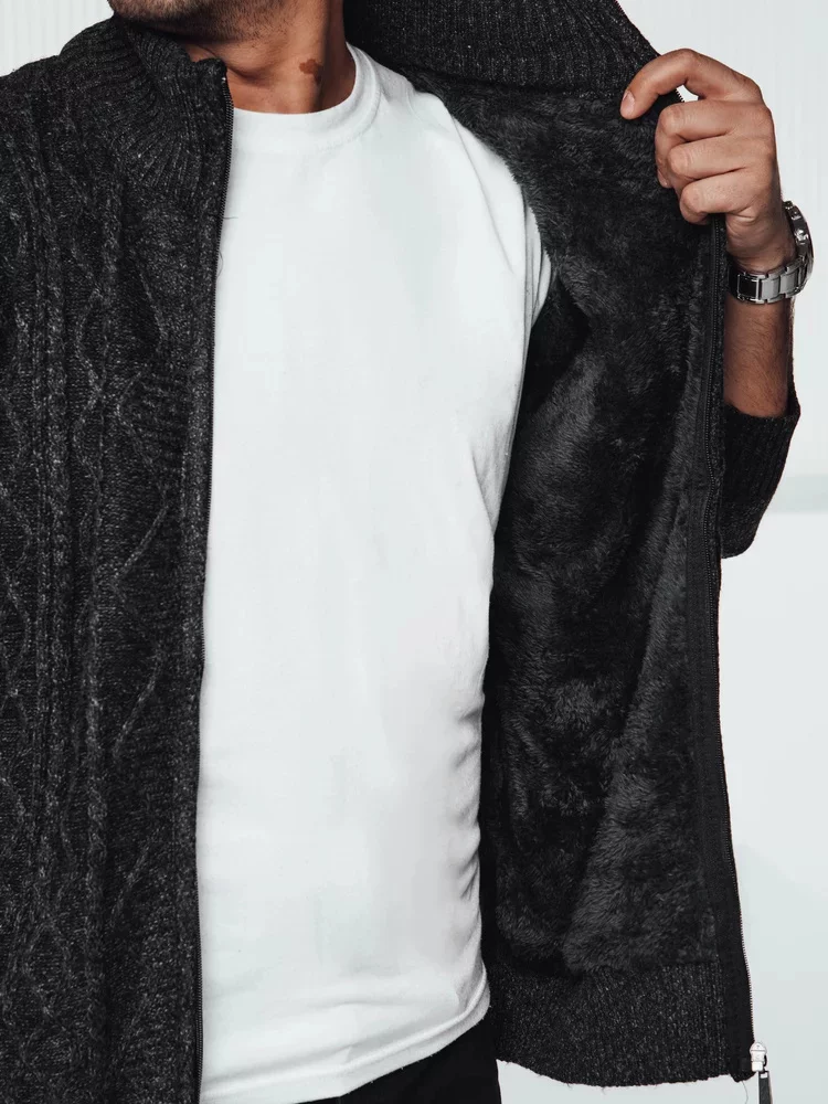 Zateplený pánský svetr. Zapínání na zip. Dvě vnější kapsy. Zateplený kožešinou. Límec typu stojáček. Spodek a rukávy zakončené manžetami. Složení: 60% akryl, 30% vlna, 10% elastan.