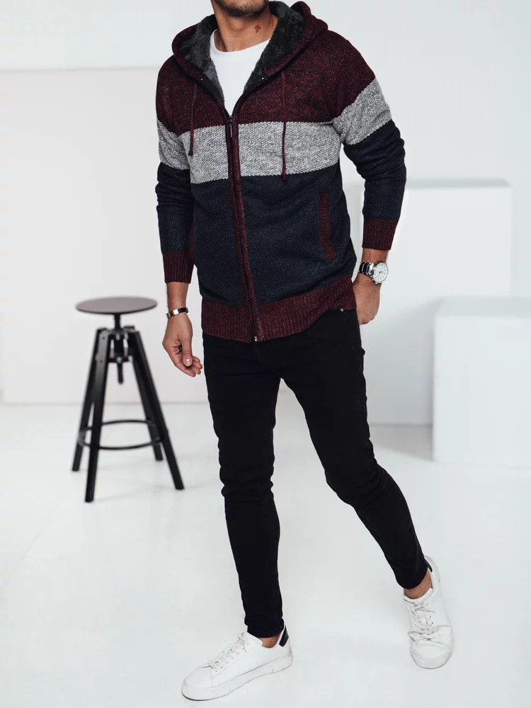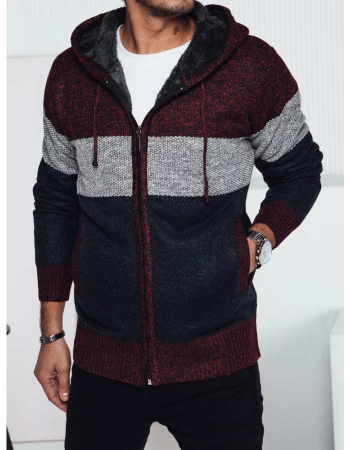 Zateplený pánský svetr. Zapínání na zip. Dvě vnější kapsy. Zateplený kožešinou. Regulovatelná kapuce. Límec typu stojáček. Spodek a rukávy zakončené manžetami. Složení: 60% akryl, 30% vlna, 10% elastan.