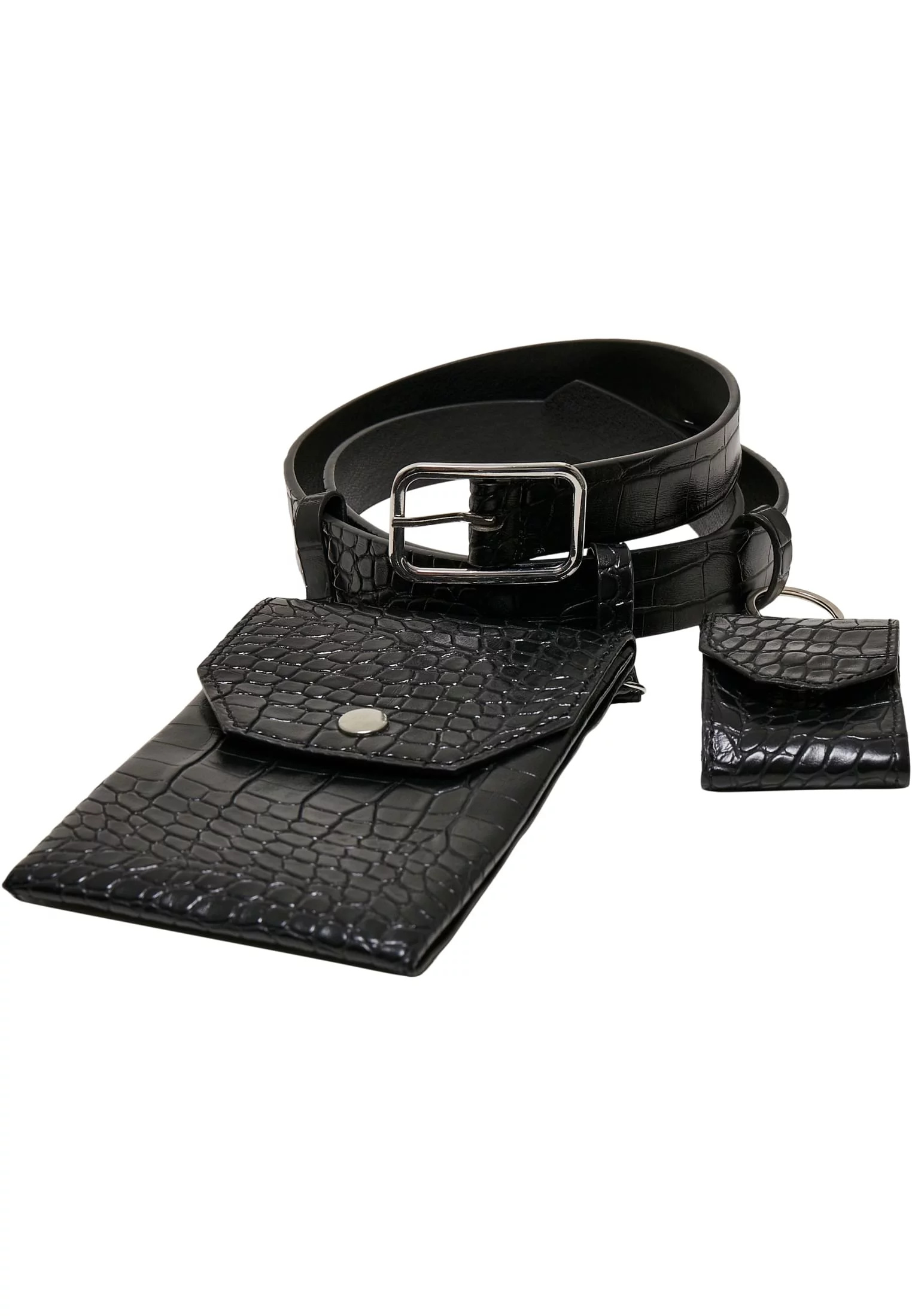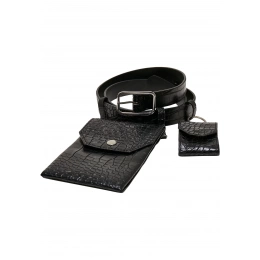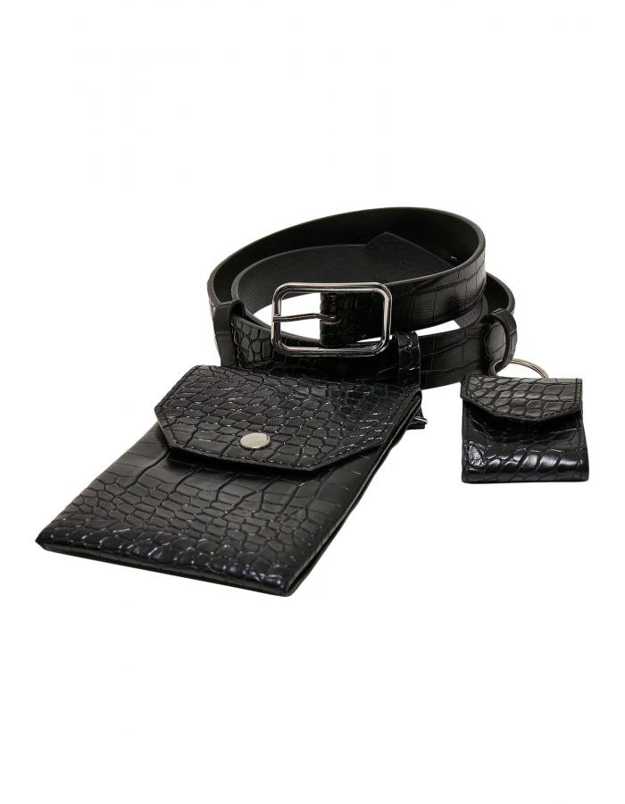 Pásek z umělé krokodýlí kůže má tři poutka na opasek a zapíná se na špendlíkovou přezku. Jeho stylovým vrcholem jsou dvě připojené kapsy: menší s drukem je ideální na mince, obdélníková druková kapsa na osobní doklady. Na zadní straně je zdobena nýty. Pásek je vyroben z pevného materiálu PU umělé kůže a je dostupný v délkách 105 a 125 centimetrů.
