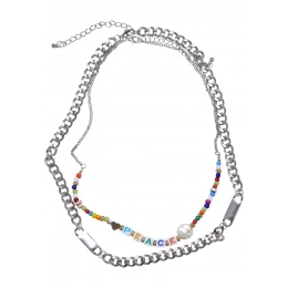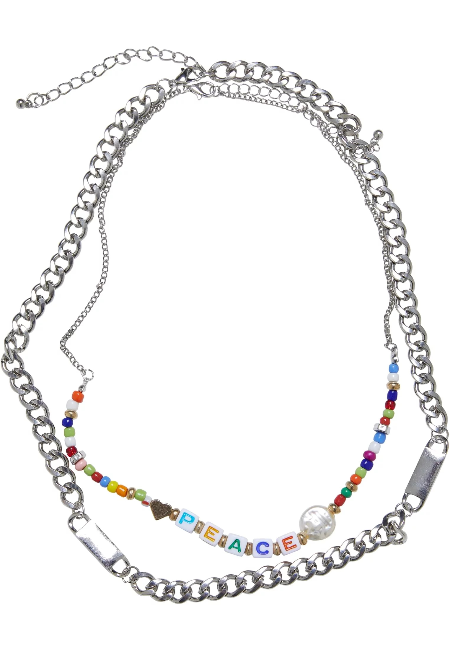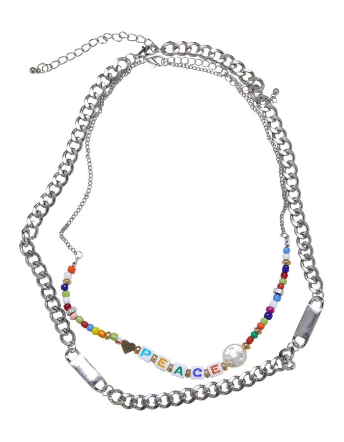 Dvoudílná sada šperků se skládá ze dvou různých náhrdelníků vyrobených ze železa. Větší náhrdelník je opatřen spojovacími prvky a skládá se z řetízkových článků. Menší náhrdelník je více filigránský, ale zdobený barevnými plastovými korálky a veselým nápisem "Peace".