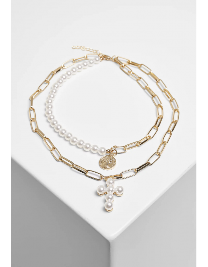 Třpytivé perly se setkávají se zlatem: tento dvouřadý náhrdelník Urban Classics ukazuje, jak efektivně kombinovat perly s třpytivým kovem. Vnitřní řetízek se skládá z 50% perel a 50% řetízkových článků. Vnější řetěz je celý řešen jako kotevní řetěz. Zcela zvláštní jsou dva přívěsky: malý amulet s hlavou a kříž z perel. Náhrdelník je mimochodem vyroben ze stabilní slitiny a ABS.