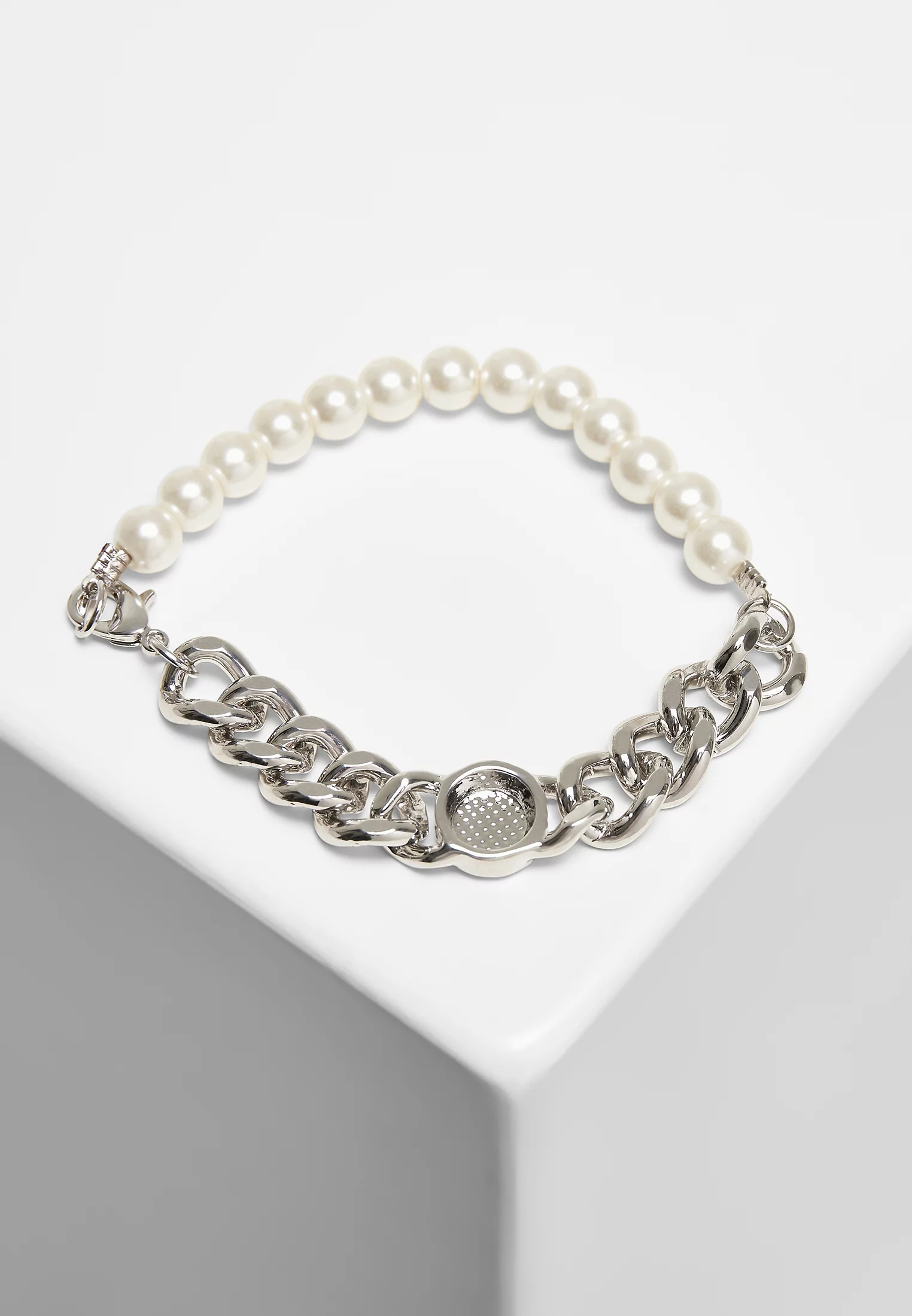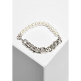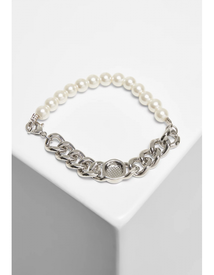 Chytrý městský klasický náramek, který doplní každý outfit na ulici. Polovinu náramku tvoří řada perel a druhou polovinu plochý obrubníkový řetízek, který je doplněn kruhovým prvkem. Trendový doplněk je vyroben ze železa a skla.