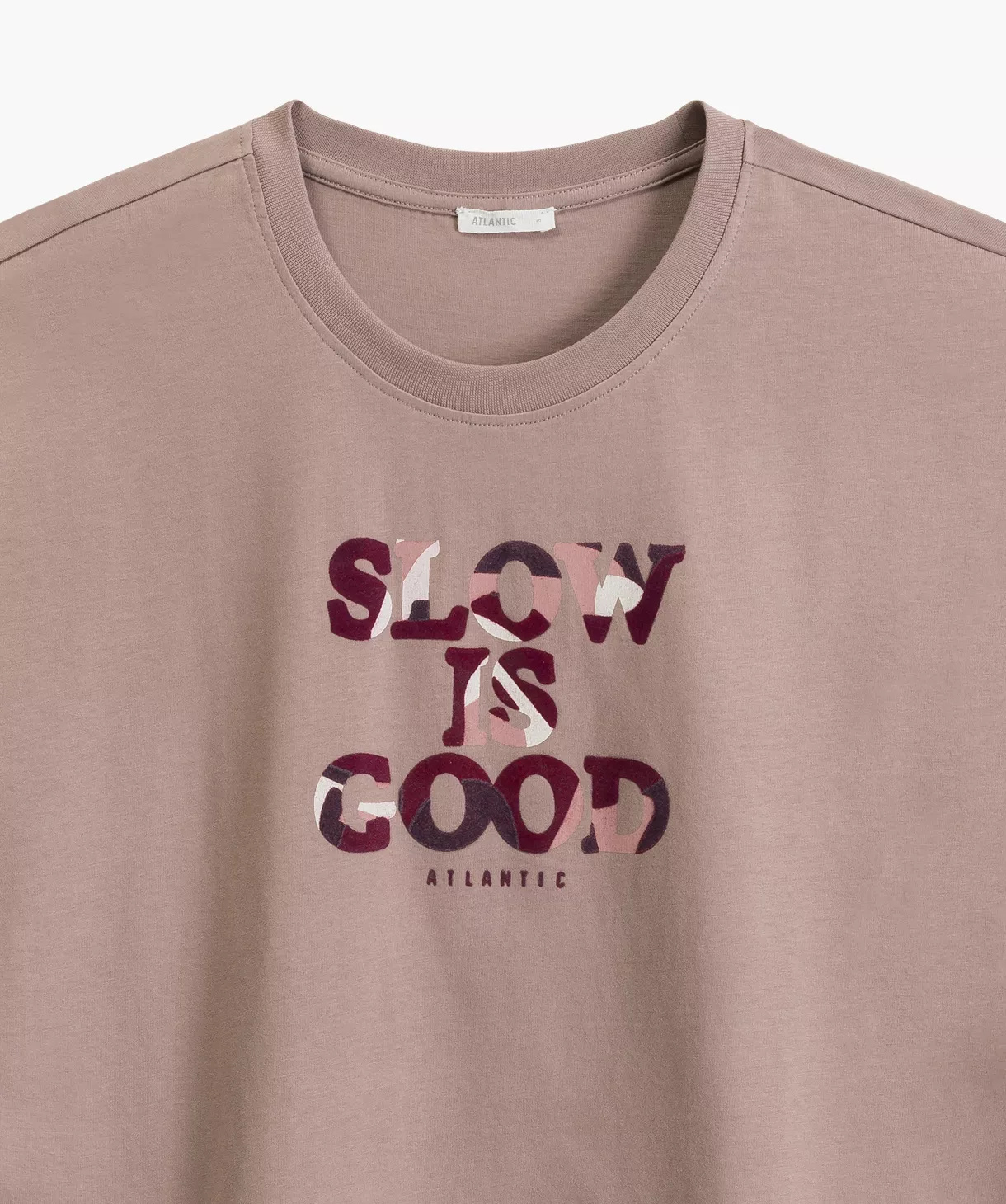 Horní díl s dlouhým rukávem je zdoben výrazným potiskem „Slow is good“, který evokuje pocit klidu, pohody a relaxace. Kalhoty jsou navrženy v klasickém střihu, zakončené manžetami, s elastickým pasem stáhnutelným šňůrkou pro pohodlné přizpůsobení postavě. Praktické boční kapsy u kalhot navíc spojují styl s funkčností