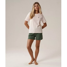Lehké a komfortní pyžamo Atlantic NLP-498E je ideální volbou pro teplejší noční dny i domácí relaxaci. Jedná se o dvoudílný set složený z volného trička s krátkým rukávem a pohodlných šortek. Horní díl působí svěže a střídmě, doplněn decentní výšivkou na prsou. Kalhoty ve variantě „E“ (šortky) mají elastický pas se šňůrkou, která zajišťuje, že se pyžamo přizpůsobuje příjemně na těle — pohyb je volný, nic neškrtí. Šortky jsou navíc vybaveny praktickými bočními kapsami.