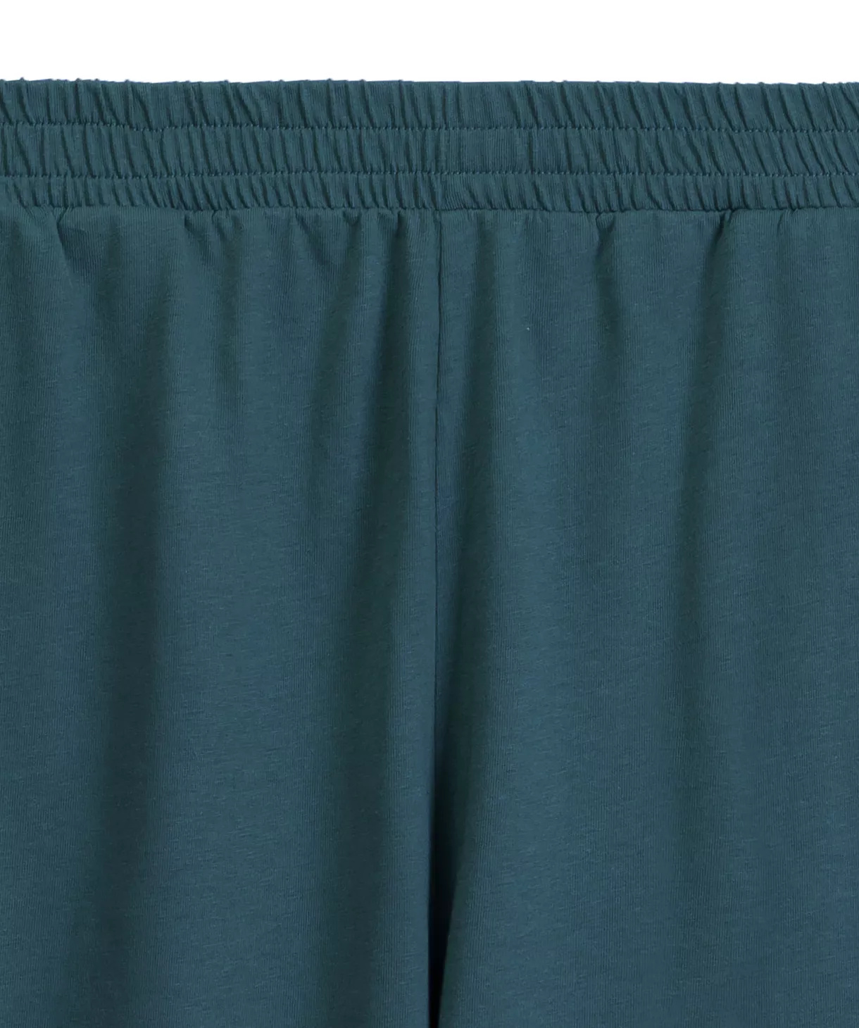 Horní díl má volnější střih s kulatým výstřihem a dlouhými rukávy bez manžet pro maximální komfort pohybu. Kalhoty jsou doplněny praktickými bočními kapsami a pasem — pro větší pohodlí během nošení.