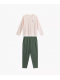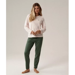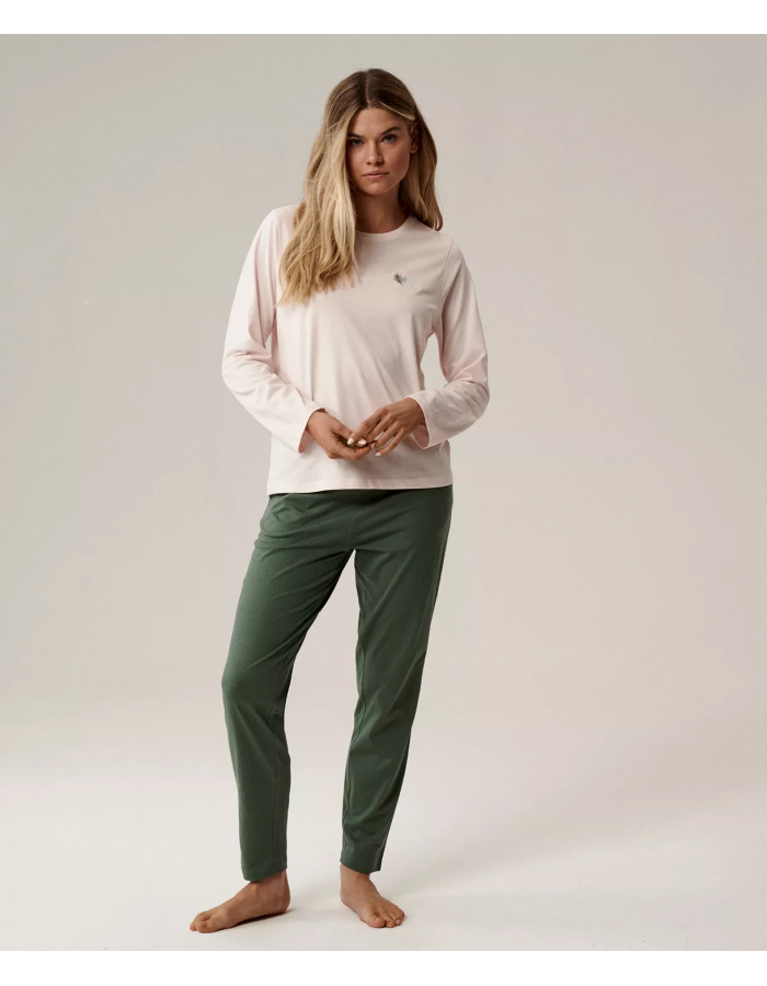 Horní díl má volnější střih s kulatým výstřihem a dlouhými rukávy bez manžet pro maximální komfort pohybu. Kalhoty jsou doplněny praktickými bočními kapsami a pasem — pro větší pohodlí během nošení.