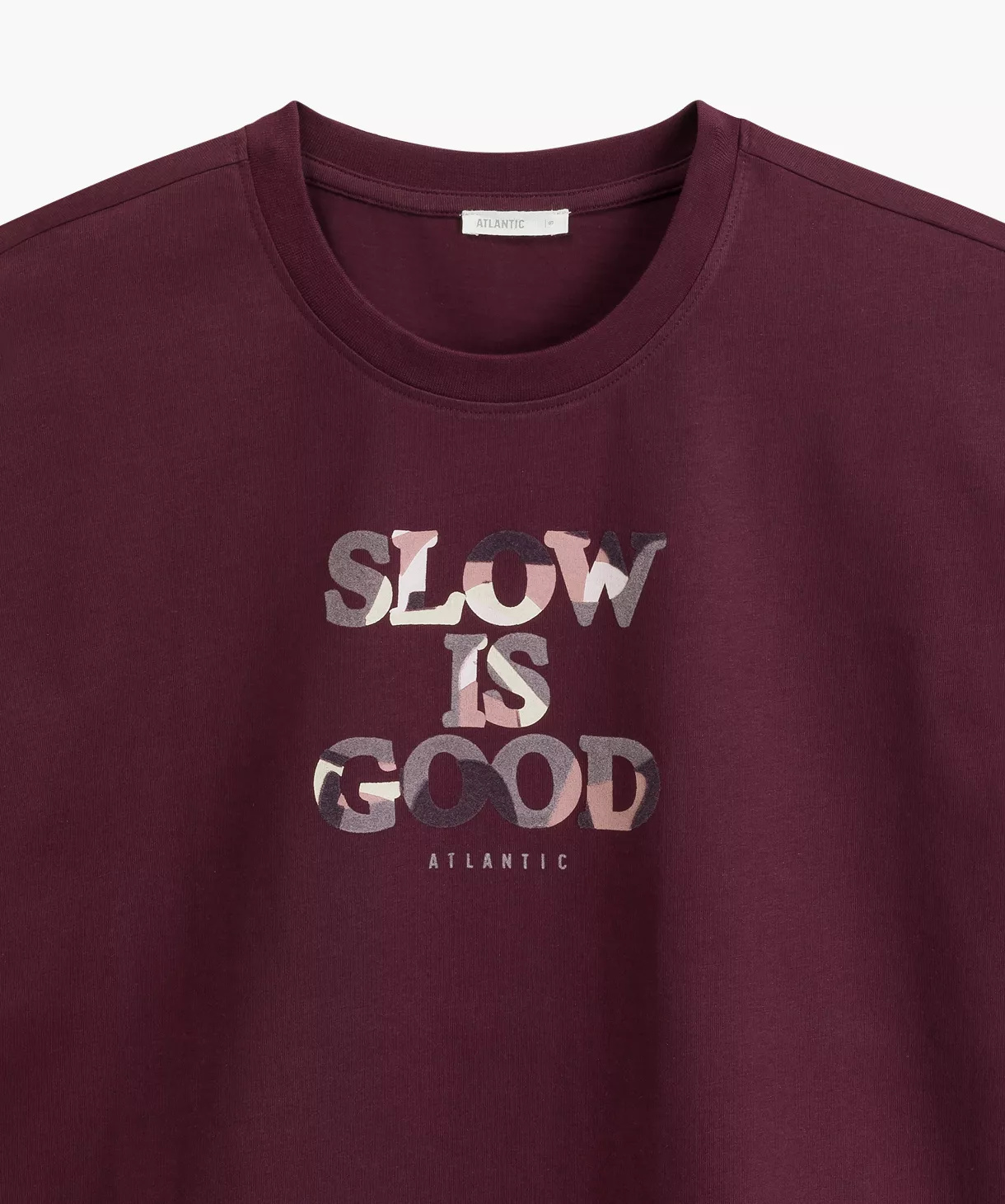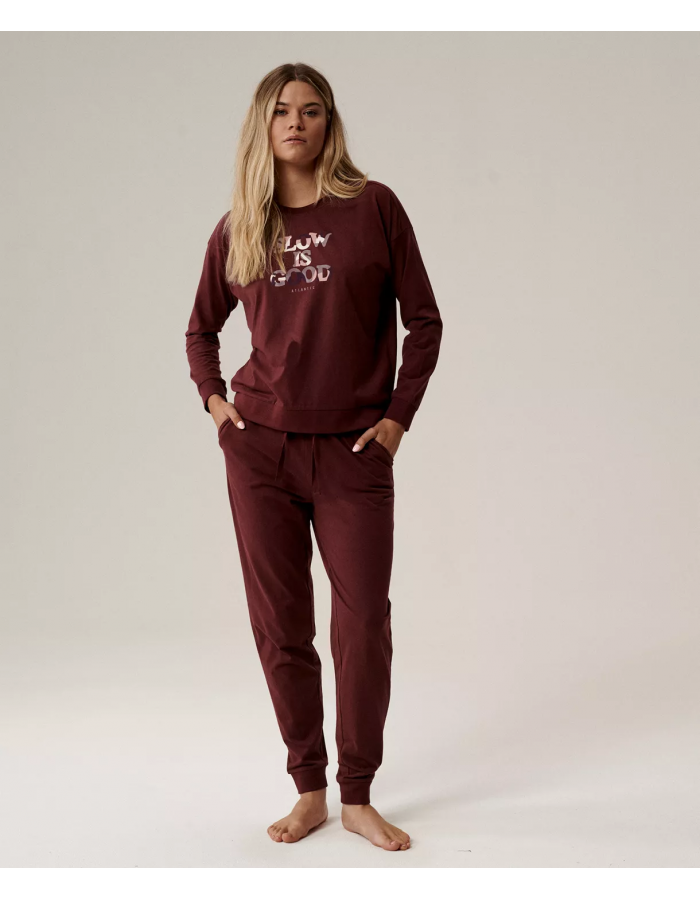 Horní díl s dlouhým rukávem je zdoben výrazným potiskem „Slow is good“, který evokuje pocit klidu, pohody a relaxace. Kalhoty jsou navrženy v klasickém střihu, zakončené manžetami, s elastickým pasem stáhnutelným šňůrkou pro pohodlné přizpůsobení postavě. Praktické boční kapsy u kalhot navíc spojují styl s funkčností