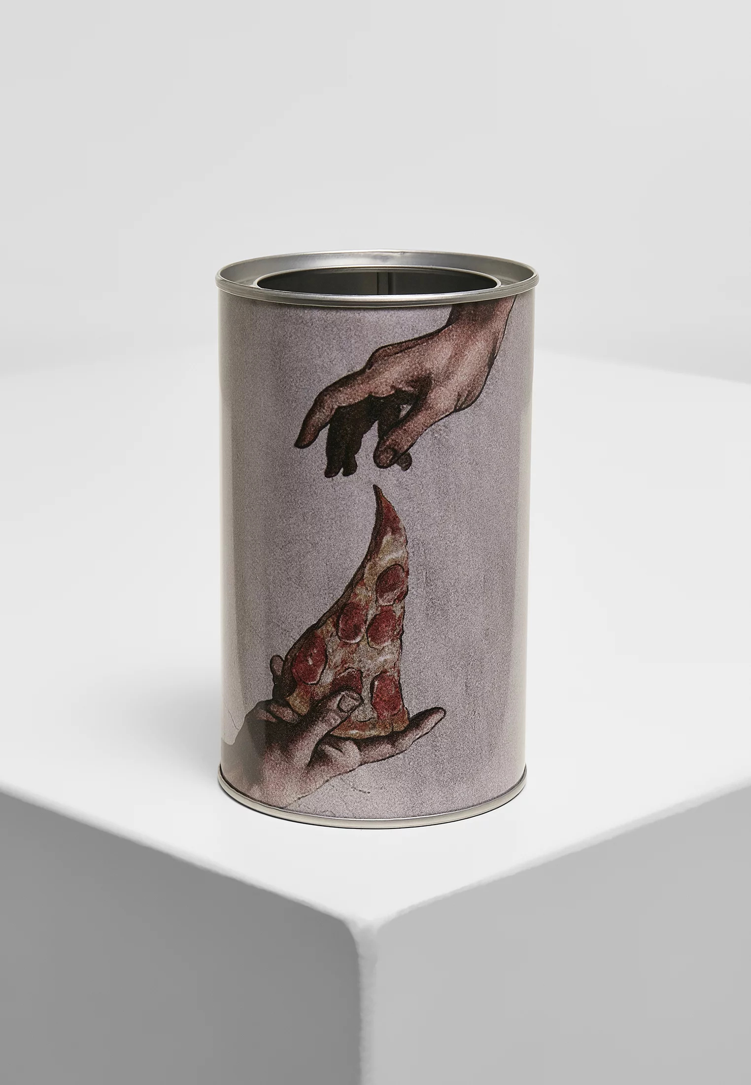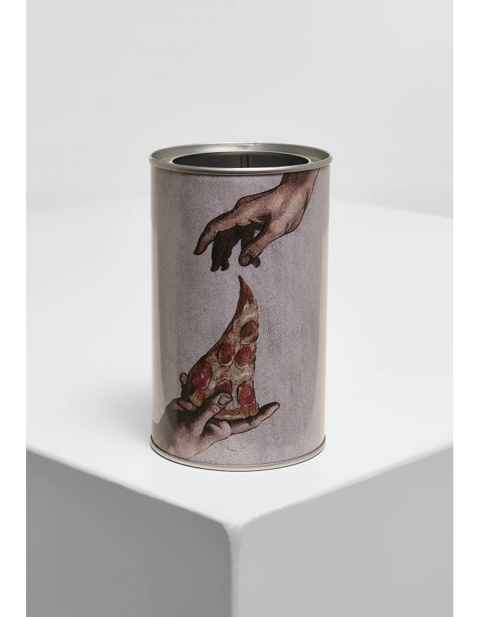 Tento držák na tužku vyrobený z pocínovaného plechu spojuje humor s uměním. Motiv vychází ze slavného „stvoření Adama“ od renesančního umělce Michelangela. V této verzi však Boží ruka prodlužuje plátek pizzy. Držák pera je 12 centimetrů vysoký a 7.5 centimetrů v průměru.