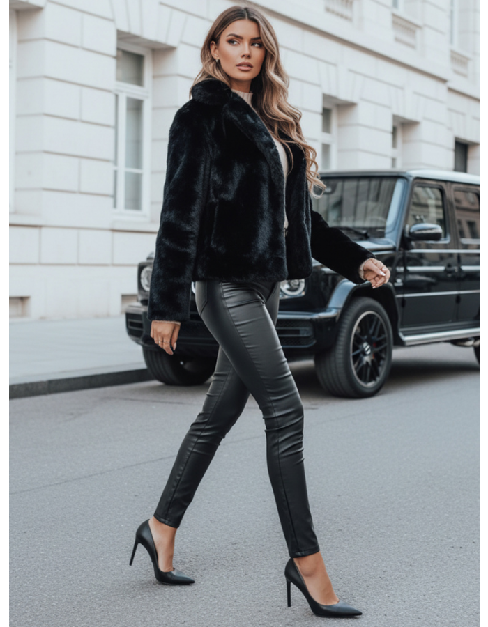 Damski krótki płaszczyk futerkowy to stylowa propozycja na sezon jesienno-zimowy. Wykonany z miękkiego, przyjemnego w dotyku materiału, zapewnia komfort i ciepło. Klasyczny kołnierz dodaje elegancji, a minimalistyczny fason doskonale uzupełnia codzienne i wieczorowe stylizacje.