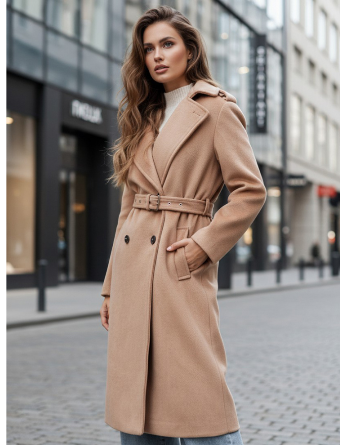Elegancki płaszcz damski o klasycznym kroju typu trench to doskonała propozycja na sezon jesienno-zimowy. Model posiada szeroki kołnierz z klapami zapinany na haftkę, a pasek w talii pozwala podkreślić sylwetkę i dopasować fason do własnych potrzeb. Praktyczne kieszenie oraz rozcięcie z tyłu zapewniają wygodę i komfort noszenia. Ponadczasowy krój sprawia, że płaszcz pasuje zarówno do codziennych, jak i eleganckich stylizacji.