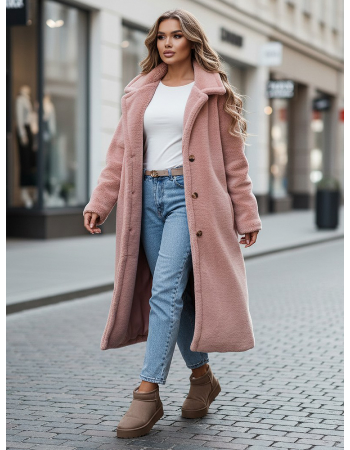 Płaszcz zimowy damski teddy futrzany długi różowy Dstreet NY0751z