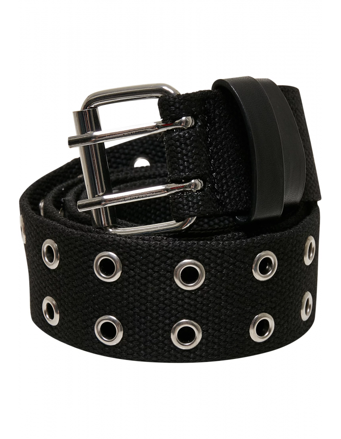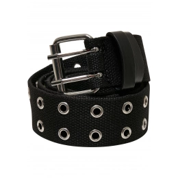 Tento jednobarevný plátěný pásek s dvojitou přezkou a dvojitou řadou kovových oček nabízí ostrý styl. Je k dispozici ve dvou délkách a je vyrobena z robustního polyesteru.
