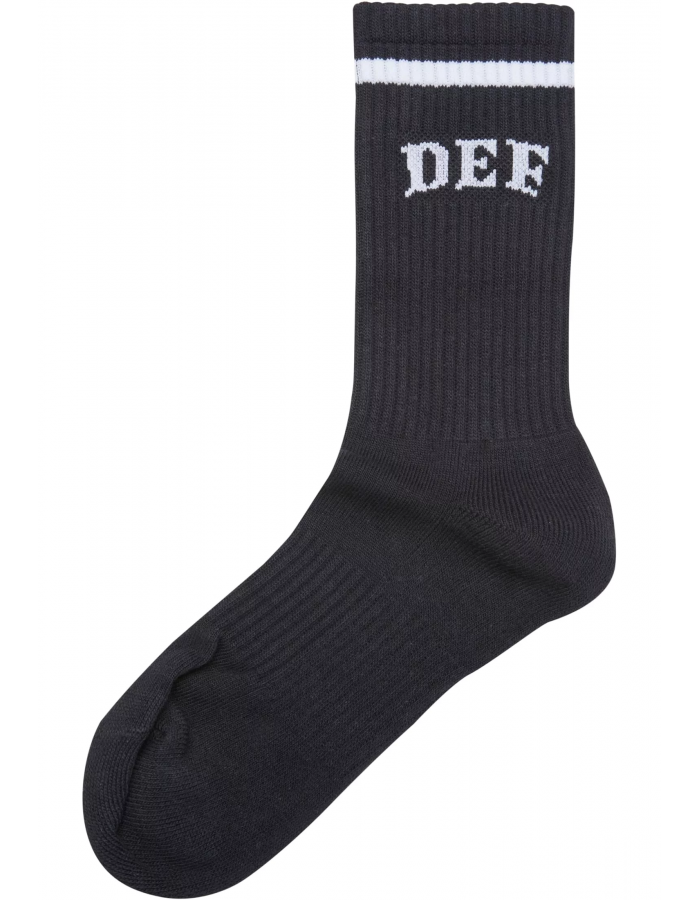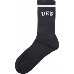 V horní části ponožek je bílý pruh a pod ním nápis "DEF" ve stylizovaném písmu také v bílé barvě. Ponožky mají klasickou délku a jsou vyrobeny z pružného materiálu, který zajišťuje pohodlné nošení. Tento styl ponožek je vhodný jak pro každodenní nošení, tak pro sportovní aktivity.