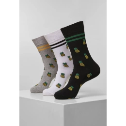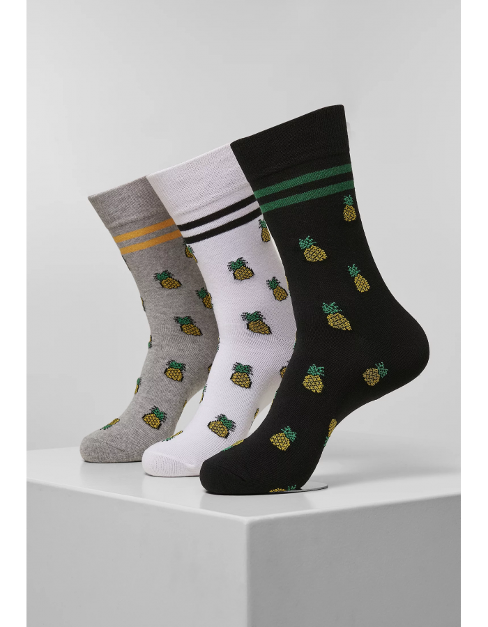Svěží, funky, ovocná – tato rozkošná trojice ponožek nabízí celoplošný ananasový design a vyzařuje super uvolněnou atmosféru, zejména v létě. Motiv doplňují dva barevné pruhy pod lemem. Samotný spodní lem je vyroben z osvědčené žebrované tkaniny, která zajišťuje optimální přizpůsobení.