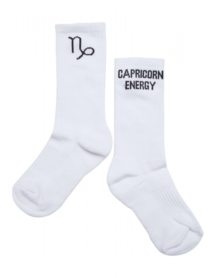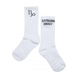 Bílé ponožky s černým nápisem 'CAPRICORN ENERGY' a symbolem znamení Kozoroha. Ponožky jsou vyrobeny z měkkého a pohodlného materiálu, který zajišťuje celodenní komfort. Tento stylový kousek je ideální pro každodenní nošení, zejména pro ty, kteří se hrdě hlásí ke svému znamení zvěrokruhu. Materiál: 78% bavlna 19% polyester 2% elastan