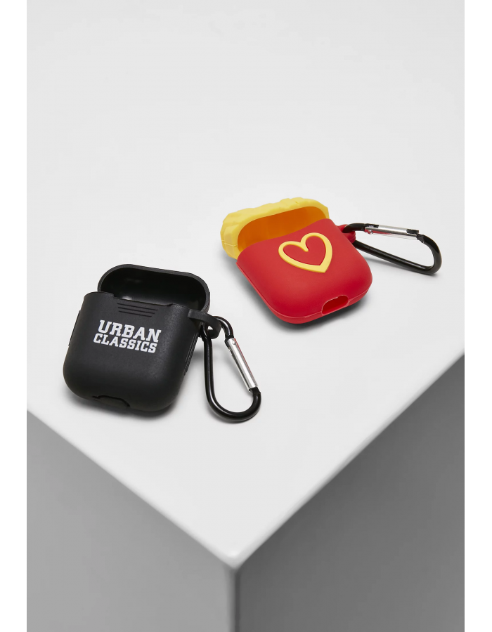 Tato funky pouzdra na sluchátka v cenově výhodném dvojbalení přináší rozmanitost do každodenního života. Jedno pouzdro je obdélníkového formátu, celé v černé barvě a s potiskem Urban Classics. Druhý nabízí netradičnější design – ať už v podobě hranolku nebo jako basketbalový míč. Víko spolehlivých silikonových pouzder pro Air Pods se snadno otevírá a zavírá. Obě pouzdra jsou vybavena karabinkou, která ladí s designem.