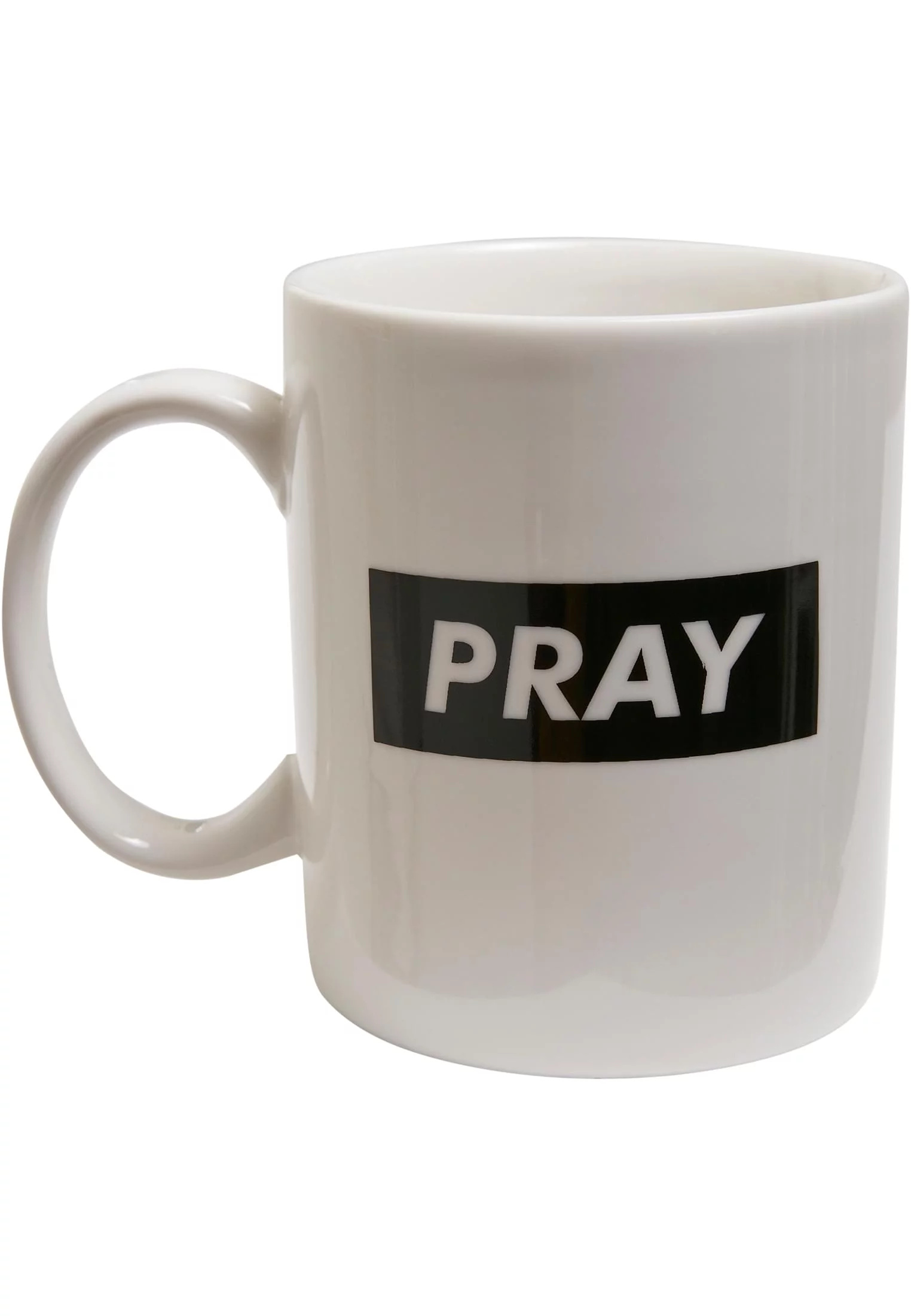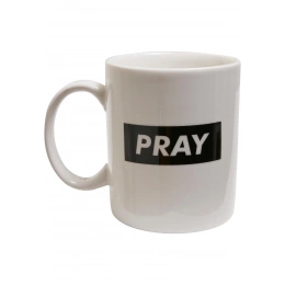 V černém obdélníku na straně tohoto hrnku je výrazně napsáno slovo „PRAY“. Na spodní straně je vytištěn odpovídající motiv modlících se rukou. Hrnek na kávu je vyroben z keramiky a má velké ucho.