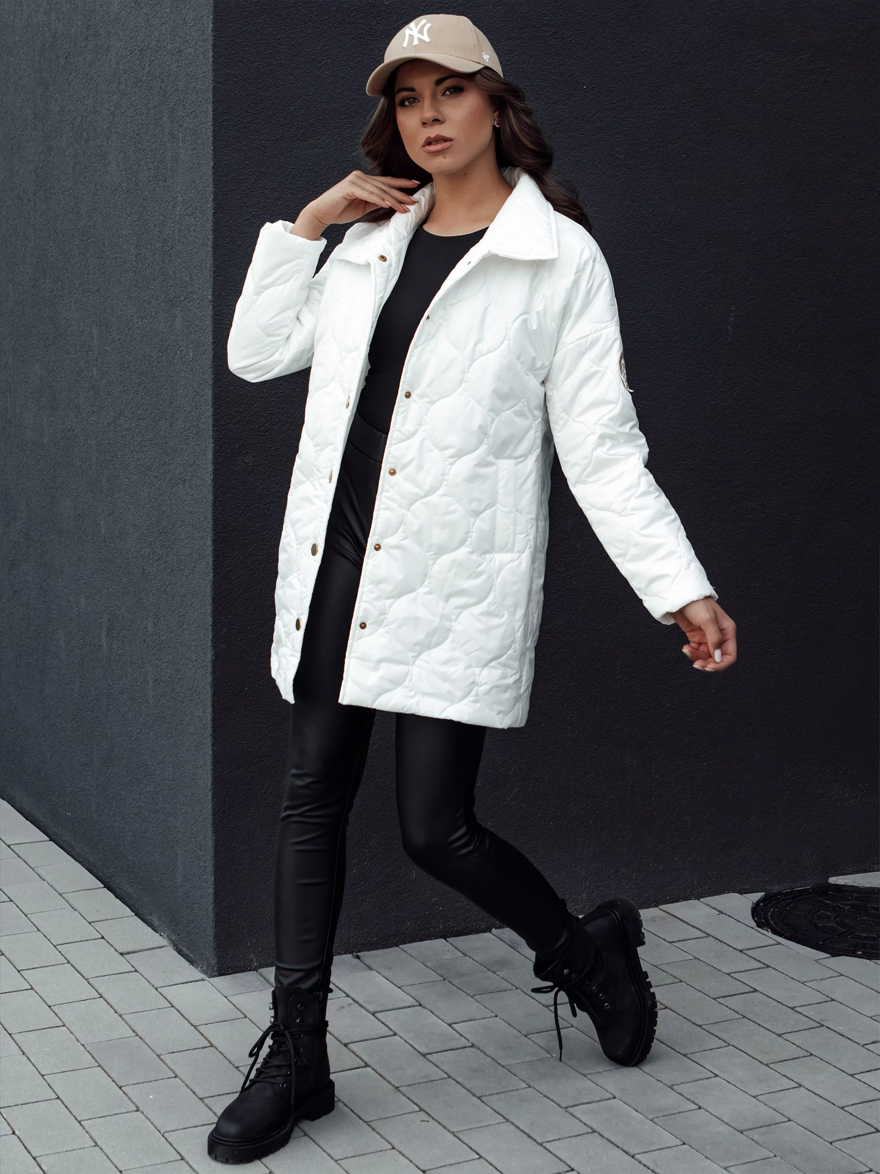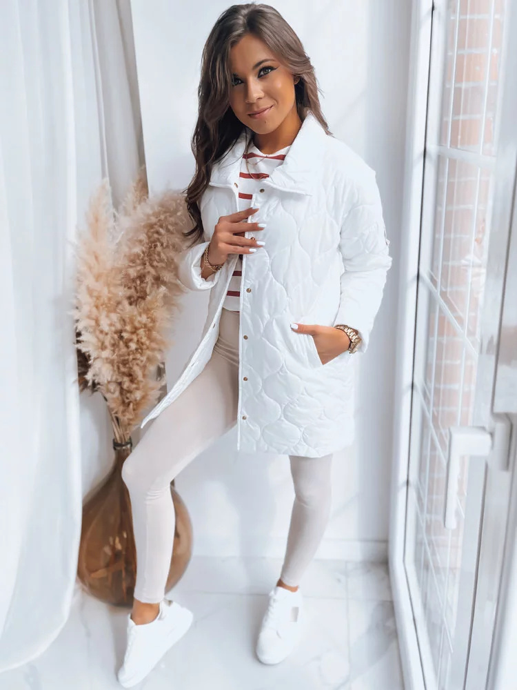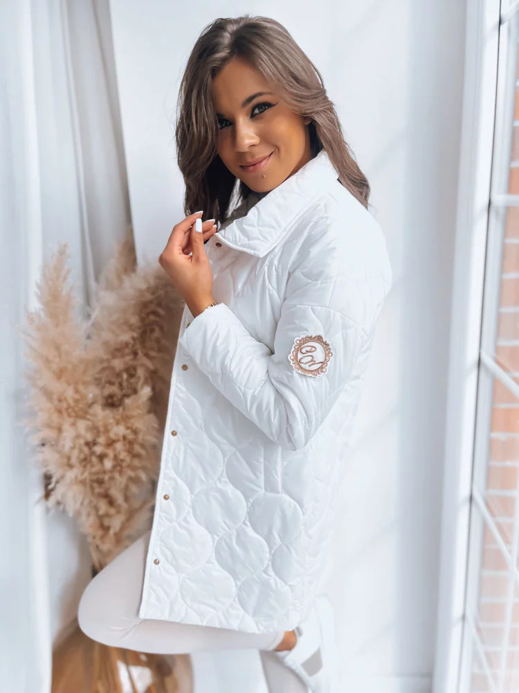 Prošívaná bunda delšího střihu s efektním límcem, vyrobená z jemného materiálu. Má kapsy v úrovni pasu a zapíná se na ozdobné druky. Na rukávu se nachází nášivka, která tvoří dekorativní prvek. Dostupná ve třech barvách.