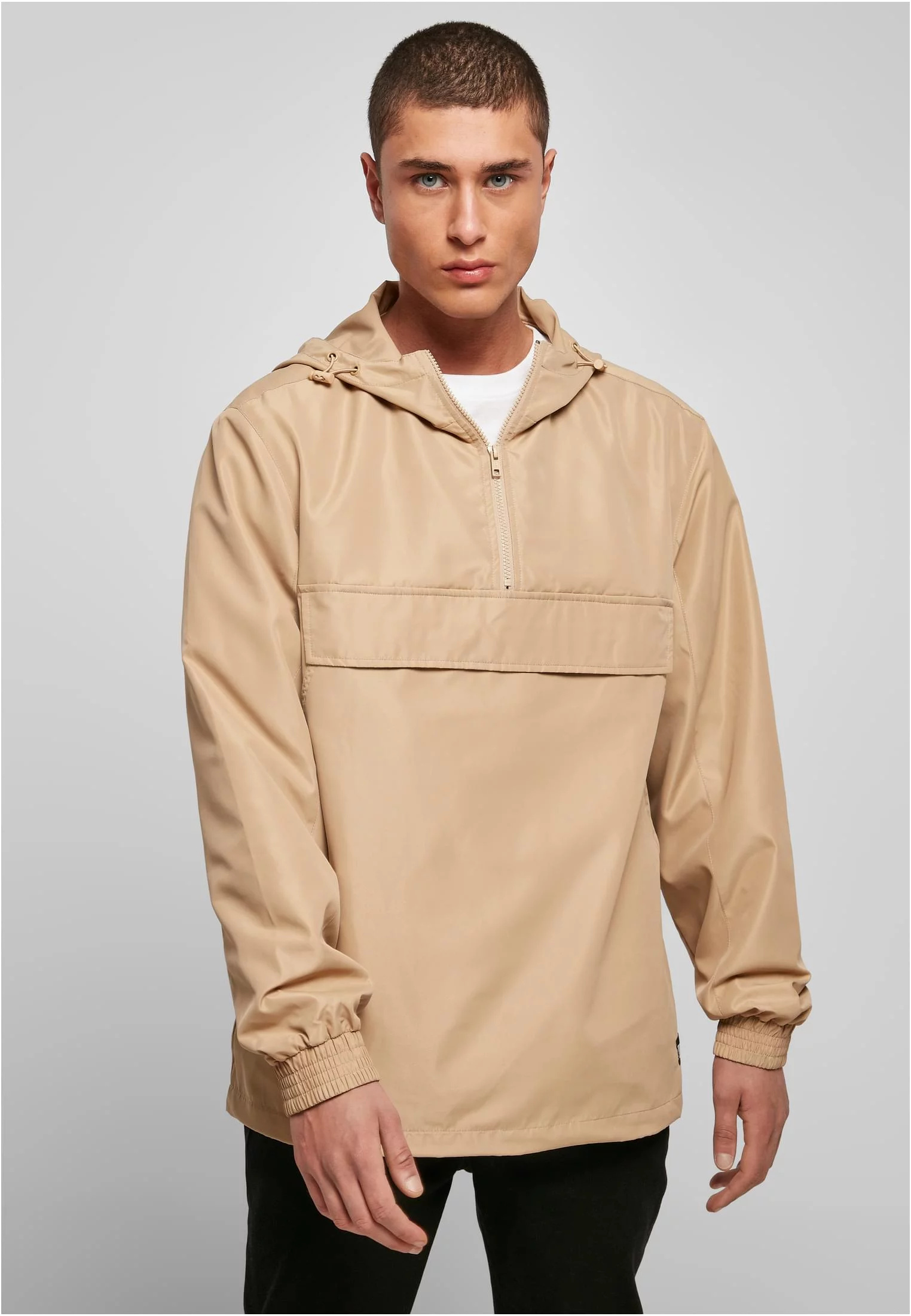 Přechodová bunda pro muže představuje zavedený design a tvar. Jeho kapuce je vybavena elastickou šňůrkou se zarážkami a zipem. Pod příčným obkladem byla umístěna náprsní kapsa se suchým zipem. Bunda Urban Classics má také dvě praktické boční kapsy a drží tvar díky elastickému pasu a širokým elastickým manžetám. Lehká pulovrová bunda má pravidelný střih a je vyrobena z voděodpudivého polyesteru, z nichž některé jsou recyklované. Body je podšité síťovinou a rukávy a kapuce taftem.