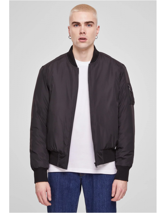 Pánská bomber bunda se prezentuje elegantně v klasickém vzhledu. Je vybavena předním zipem, širokými žebrovanými manžetami na rukávech a spodním lemu a žebrovaným stojáčkem. Známá kapsa na zip na levé horní části paže, dvě boční kapsy a jedna vnitřní kapsa doplňují pánskou bundu typu bomber. Má také prošívanou podšívku a je vyrobena z částečně recyklovaného polyesteru. Bezpečný komfort nošení se odvíjí od zvoleného pravidelného střihu.