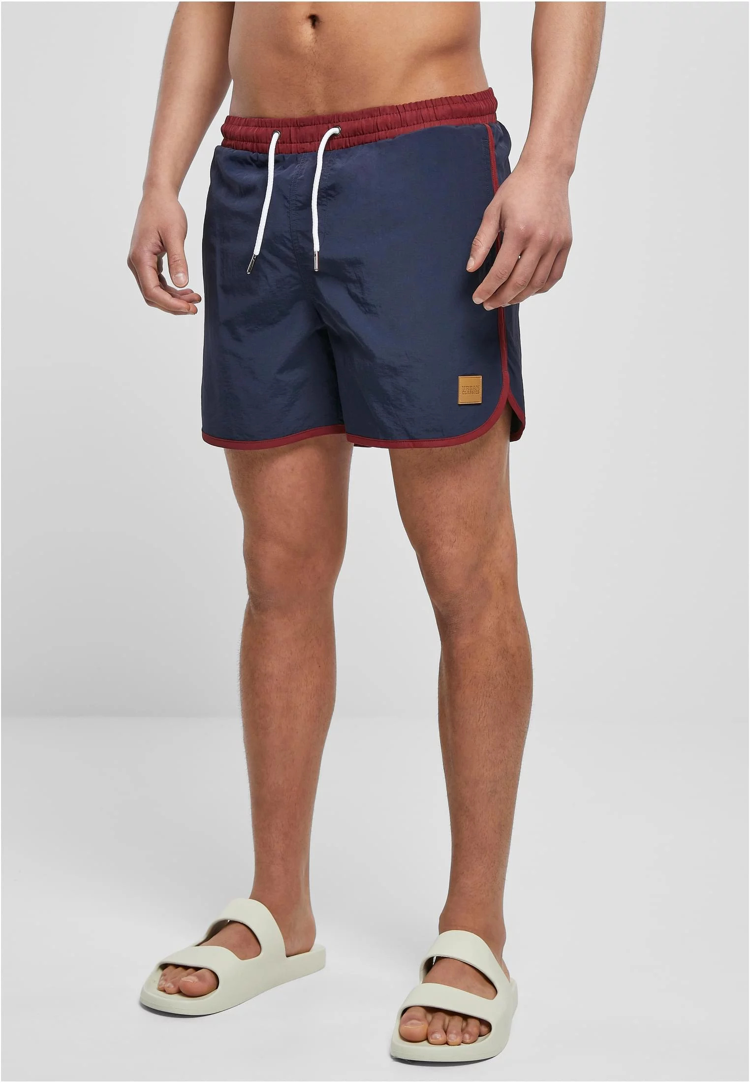 Klasický design sportovního oblečení: Retro Swimshorts vypadají opravdu autenticky díky svému krátkému střihu, mírně zakřivenému lemu nohavic, bílým kontrastním lemům a bílým odsazeným elastickým pasem se stahovací šňůrkou. Lehký nylonový materiál, boční kapsy a síťovaná vložka zajišťují optimální pohodlí.