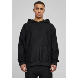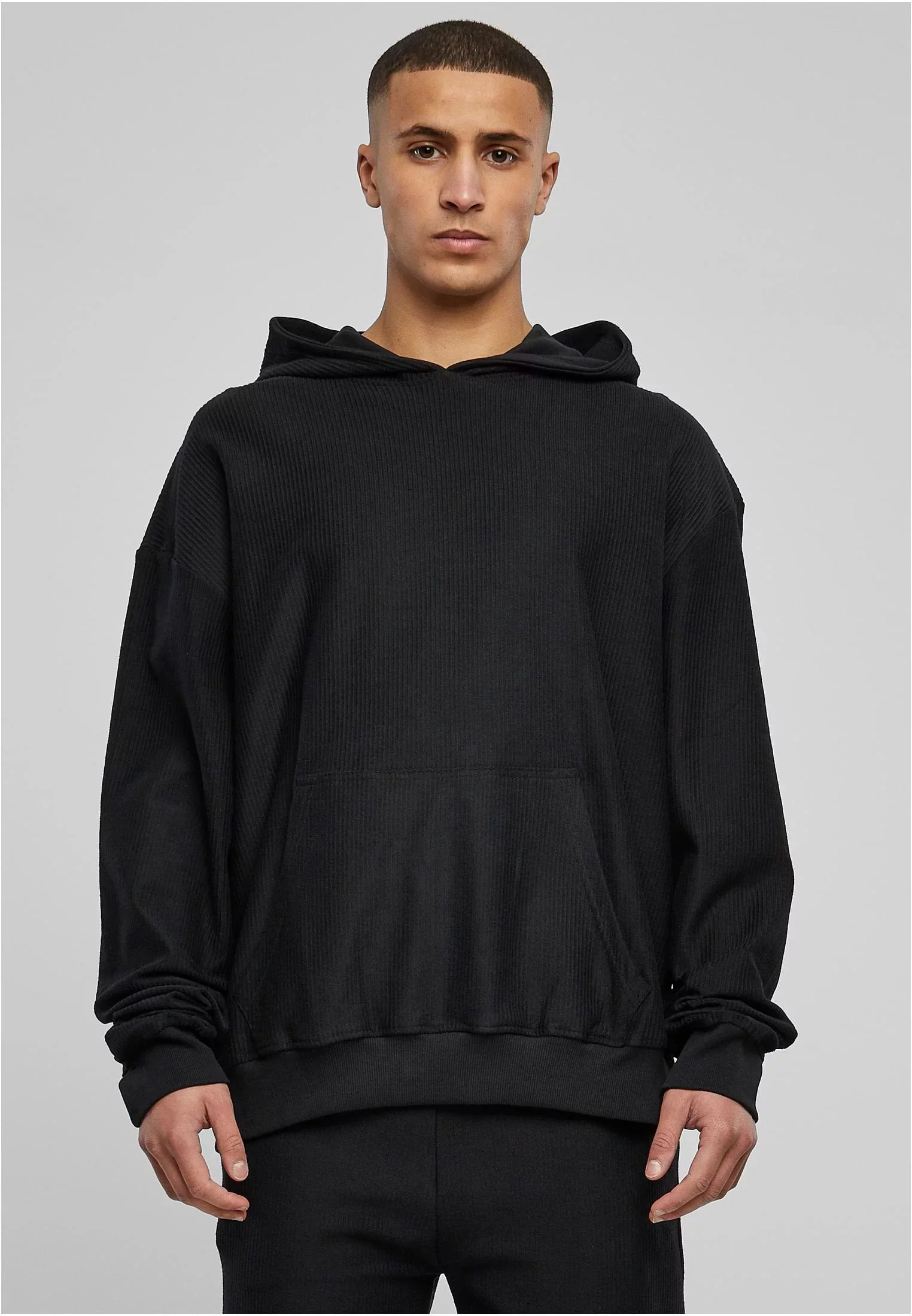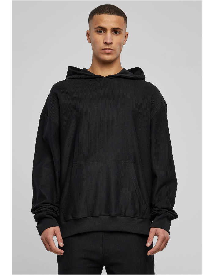 Žebrovaná froté bavlna se setkává se zavedeným hoody stylem – tento jednobarevný pánský svetr je super ležérním kouskem módy pro každý den. Jeho strukturovaný materiál obsahuje pohodlný oversize / hranatý střih se spadlými rameny a obvyklými prvky, jako je kapuce, klokaní kapsa a široké manžety na rukávech a lemu.