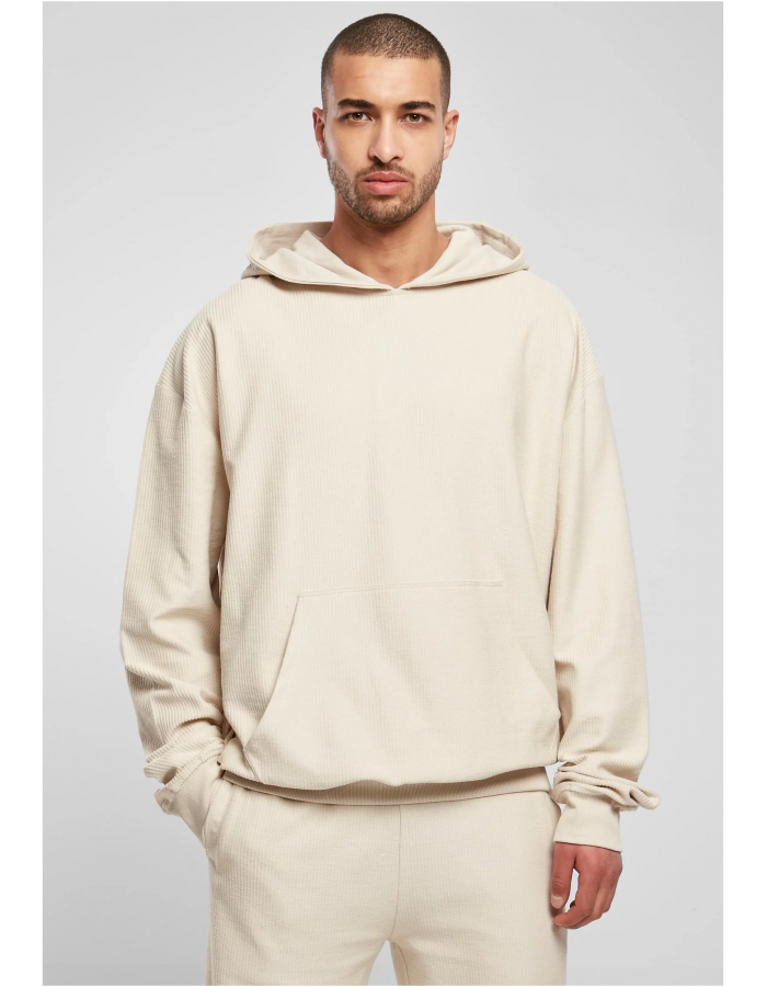 Žebrovaná froté bavlna se setkává se zavedeným hoody stylem – tento jednobarevný pánský svetr je super ležérním kouskem módy pro každý den. Jeho strukturovaný materiál obsahuje pohodlný oversize / hranatý střih se spadlými rameny a obvyklými prvky, jako je kapuce, klokaní kapsa a široké manžety na rukávech a lemu.