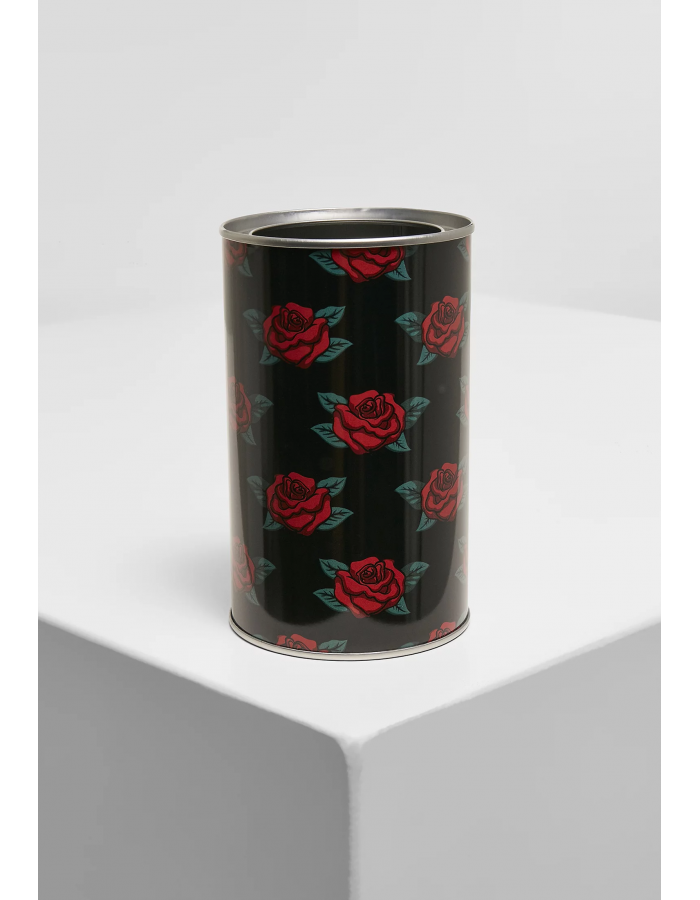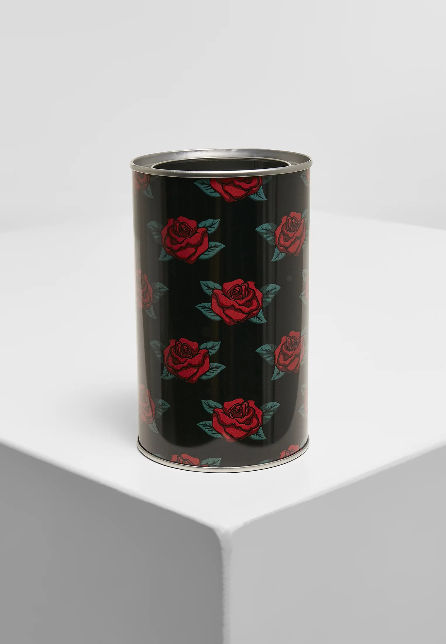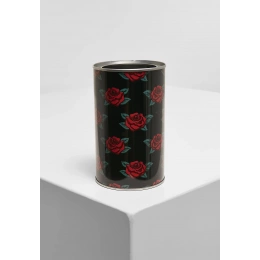 Stojan na tužku má lesklý černý povrch, který je obohacen o hravý celoplošný motiv růže. Je vyrobena z pocínovaného plechu, dosahuje výšky 12 centimetrů a nabízí průměr 7,5 centimetru.