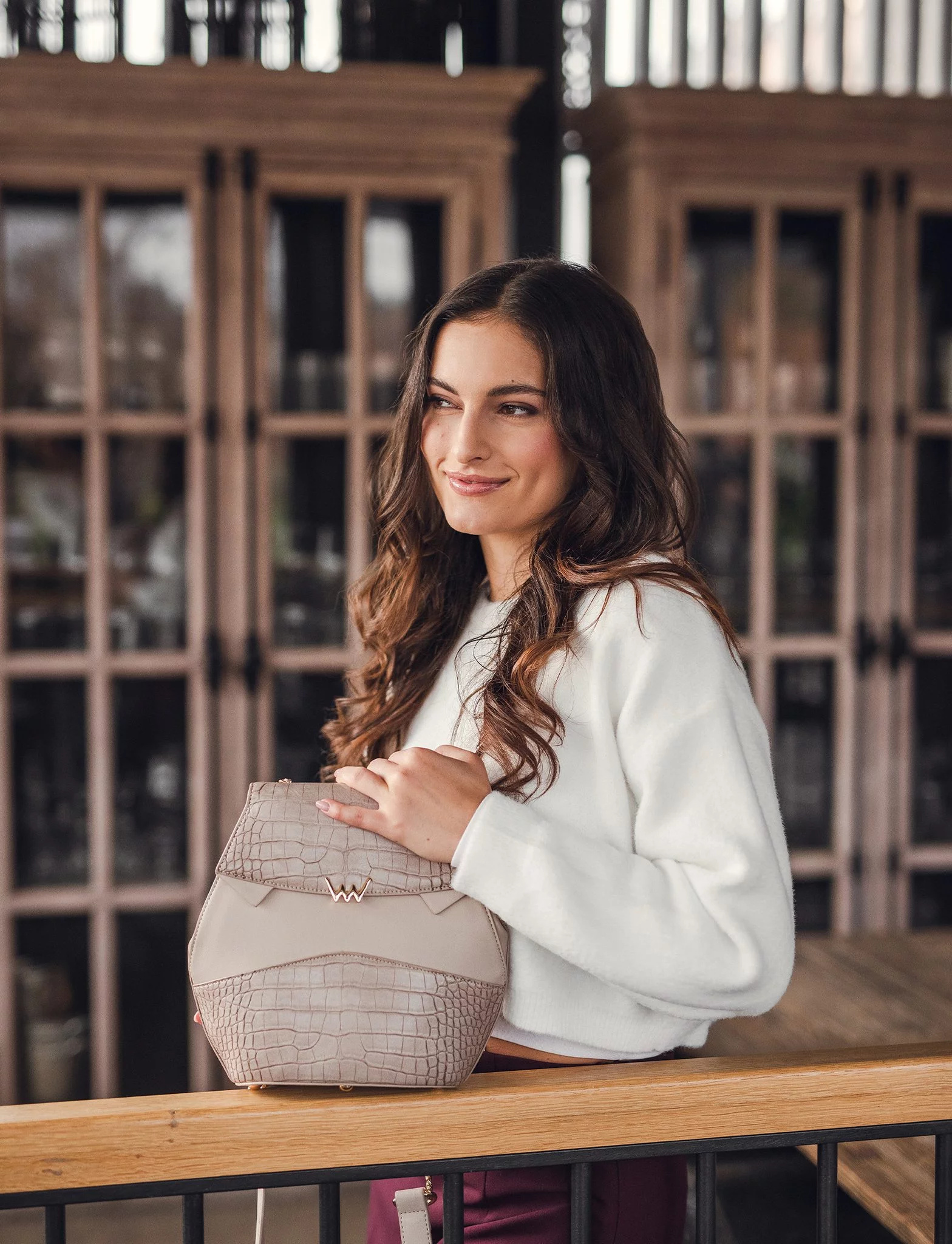 Tahle kabelka je ztělesněním každodenní elegance s nádechem krejčovského umění Dominika Navrátila. Inspiraci vzal ze střihu korzetu a ohybu klopy saka, což kabelce dodává zcela neobvyklý look. Nenápadné, ale precizní prošívání v kombinaci hladkého a strukturovaného materiálu odkazuje na mistrovské krejčovské řemeslo. Kabelka je prostě perfektní společník na odpolední kávu s přáteli, která zvládne i pár lichotek navíc.