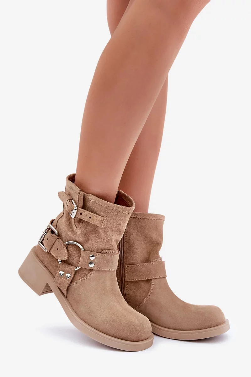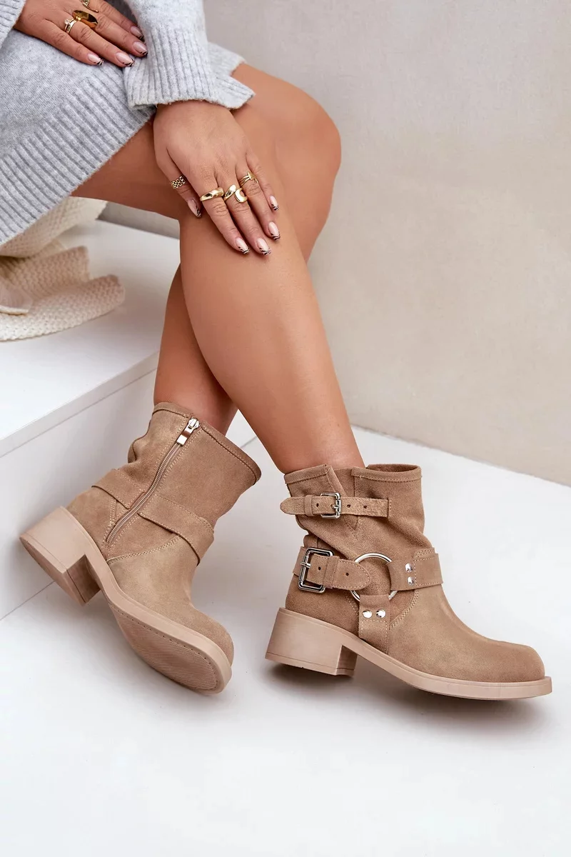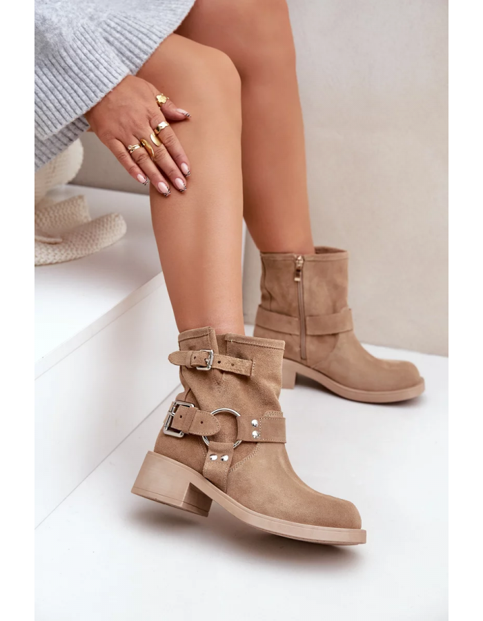 Kotníkové boty vyrobené z přírodní semiše jsou ideální volbou pro každou příležitost. Zabudované na nízkém podpatku, poskytují pohodlí a stabilitu při chůzi. Zaoblené špičky dodávají jemný charakter. Model zapínaný na zámek, což usnadňuje oblékání. Svršek zdobený efektní kombinací pásků, které dodávají stylový akcent. Tyto boty se skvěle hodí do každodenních stylizací, spojují eleganci s pohodlím. Při výběru velikosti se prosím řiďte tabulkou velikostí.