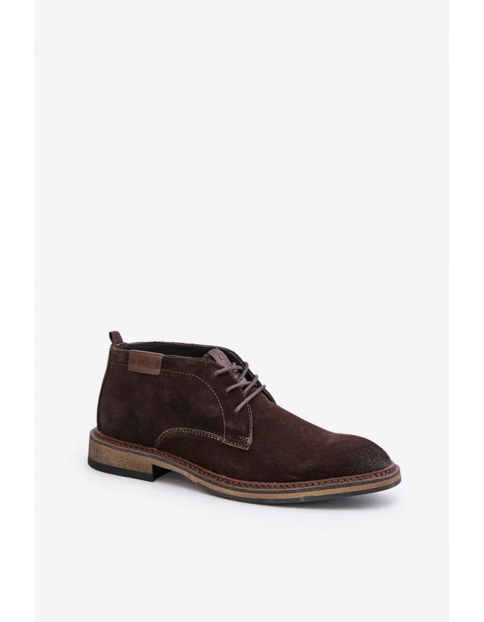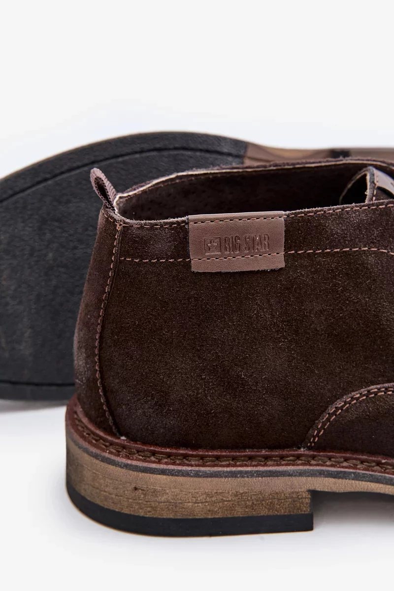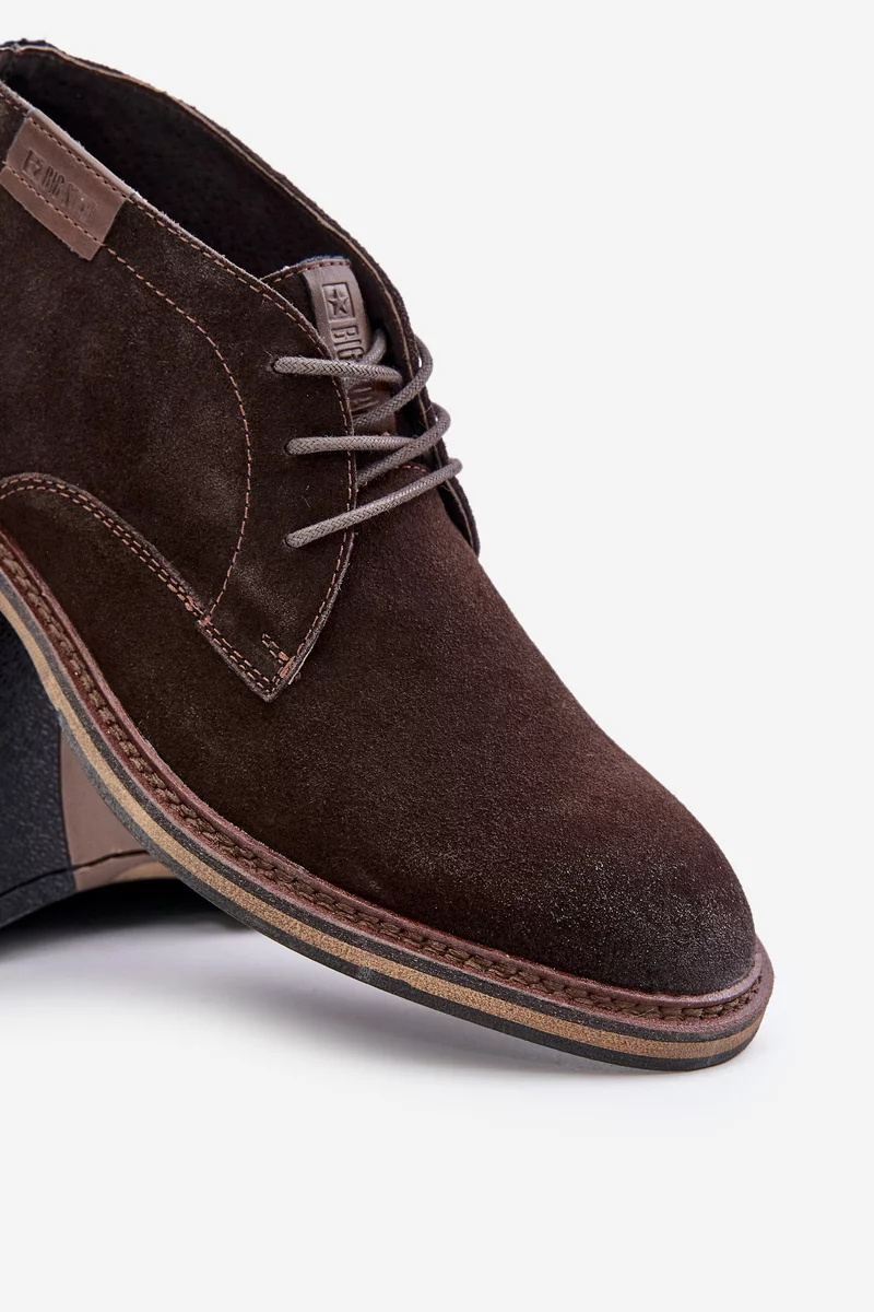 Šněrovací pánské kotníkové boty značky BIG STAR, vyrobené z přírodní semiše, se vyznačují svrškem sahajícím nad kotník a zaoblenými špičkami.