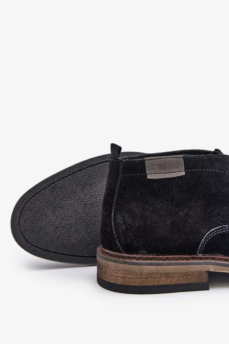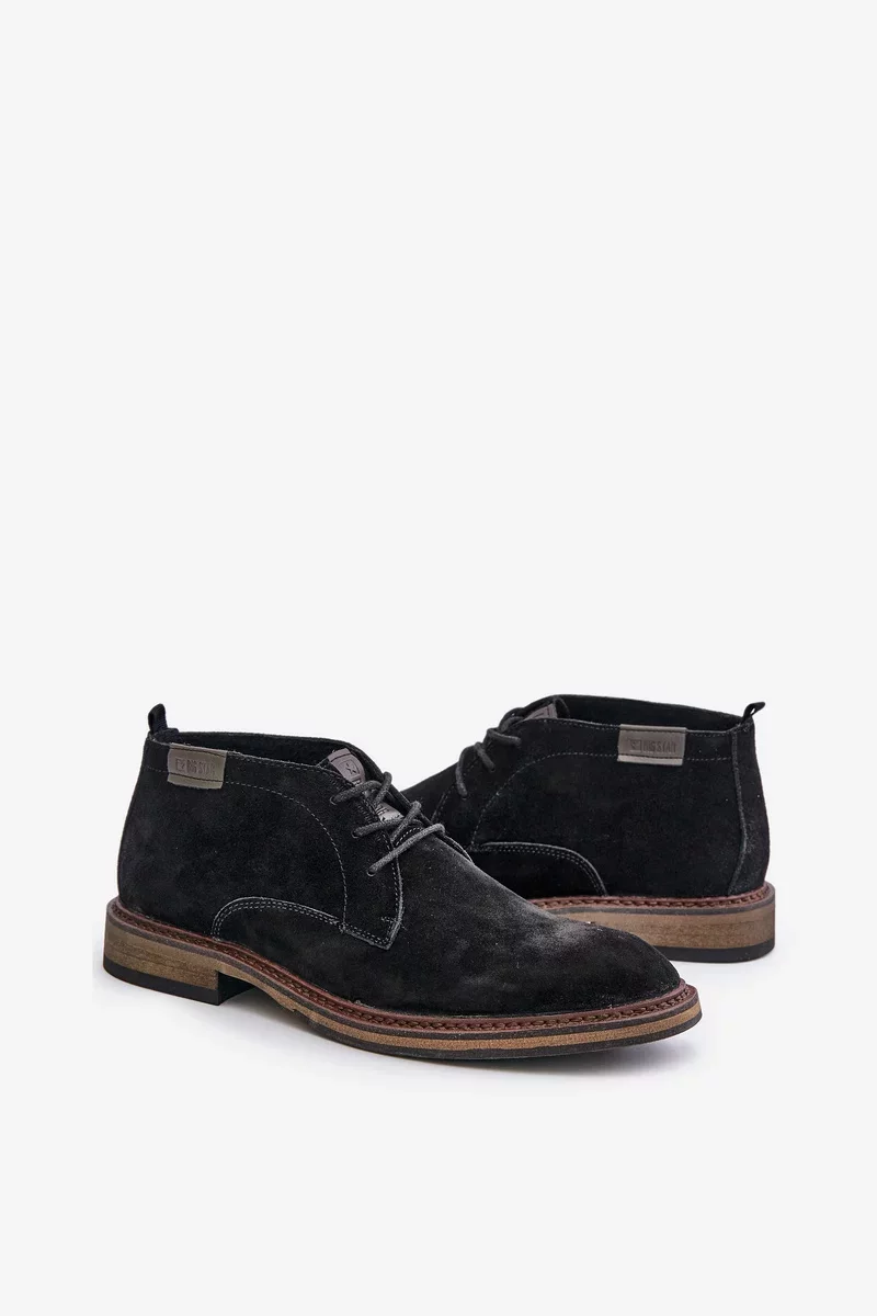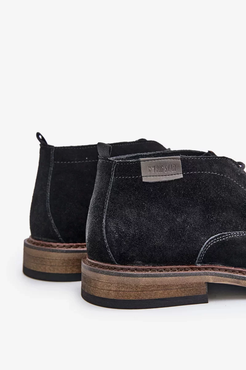 Šněrovací pánské kotníkové boty značky BIG STAR, vyrobené z přírodní semiše, se vyznačují svrškem sahajícím nad kotník a zaoblenými špičkami.