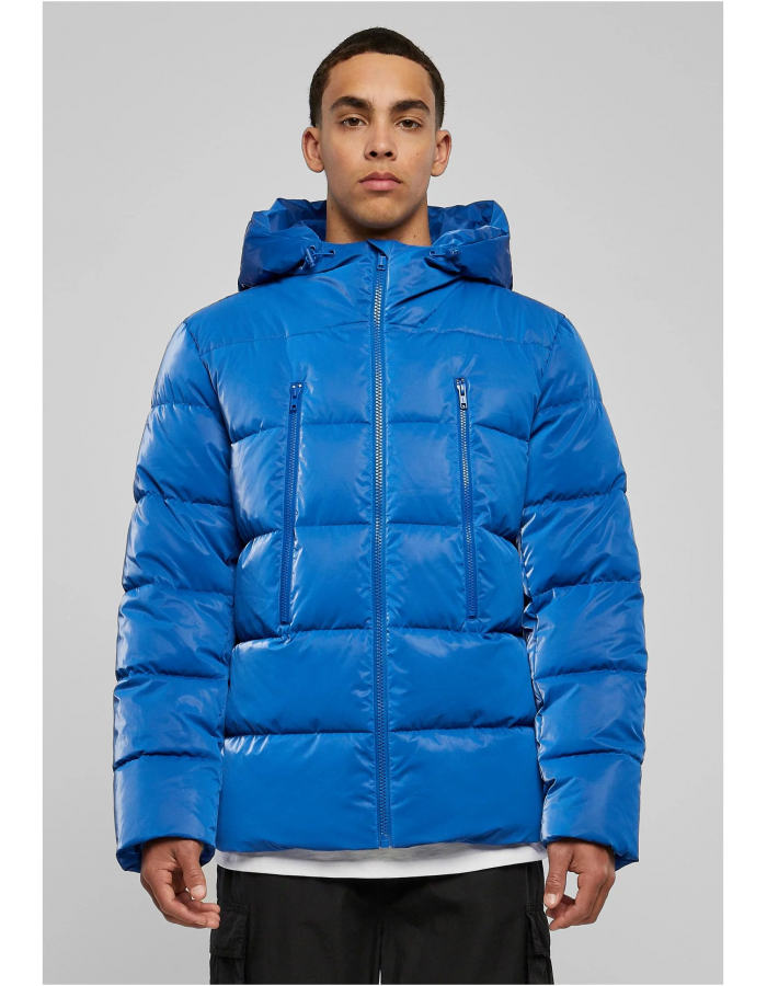 Pánská nafukovací bunda vytváří poutavý styl díky silnému prošívání a také díky svému třpytivému a obzvláště pevnému vnějšímu materiálu ve vzhledu žraločí kůže. Je náročně podšitá taftem, má boční kapsy na zip, vnitřní kapsu a přední zip. Kapuce pánské bundy i spodní lem jsou nastavitelné pomocí elastických šňůrek se zarážkou. Žebrované manžety dotvářejí styl a střih je pravidelný.
