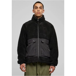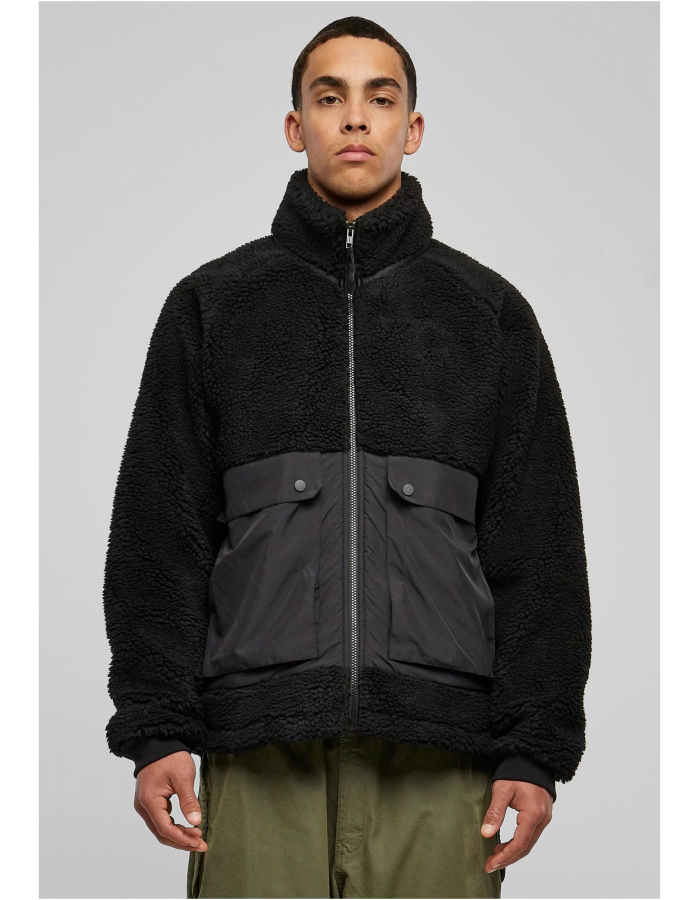 Módní pánské bundě se daří kombinovat kontrastní materiály do moderního městského vzhledu. Dvě nylonové kapsy s klopami a knoflíky jsou umístěny ve spodní třetině jinak nadýchané bundy Sherpa a vytvářejí dynamický vzhled. Bunda má také raglánový střih s bezešvými rameny, stojáčkem a předním zipem. Má krátký střih a zároveň pohodlný oversize střih. Lem lze upravit pomocí elastických stahovacích šňůrek, zatímco celkový styl završují žebrované manžety.