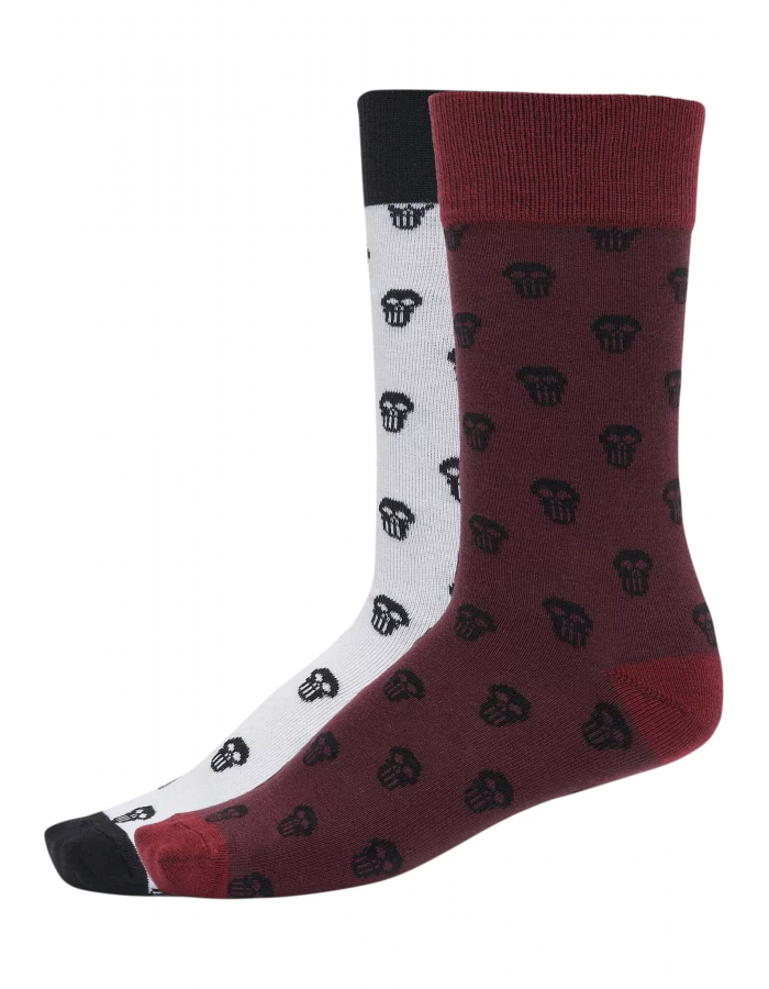 Tyto punčochy Urban Classics uspokojí celoplošným motivem lebky na bílém a vínovém pozadí. Manžety dlouhého dříku do lýtek jsou žebrované, zatímco oblast paty a špičky je barevně zvýrazněna. Módní ponožky jsou svázány v sadě po dvou. Materiál je bavlna, polyester a malé množství elastanu pro zajištění optimálního padnutí a pohodlí při nošení.