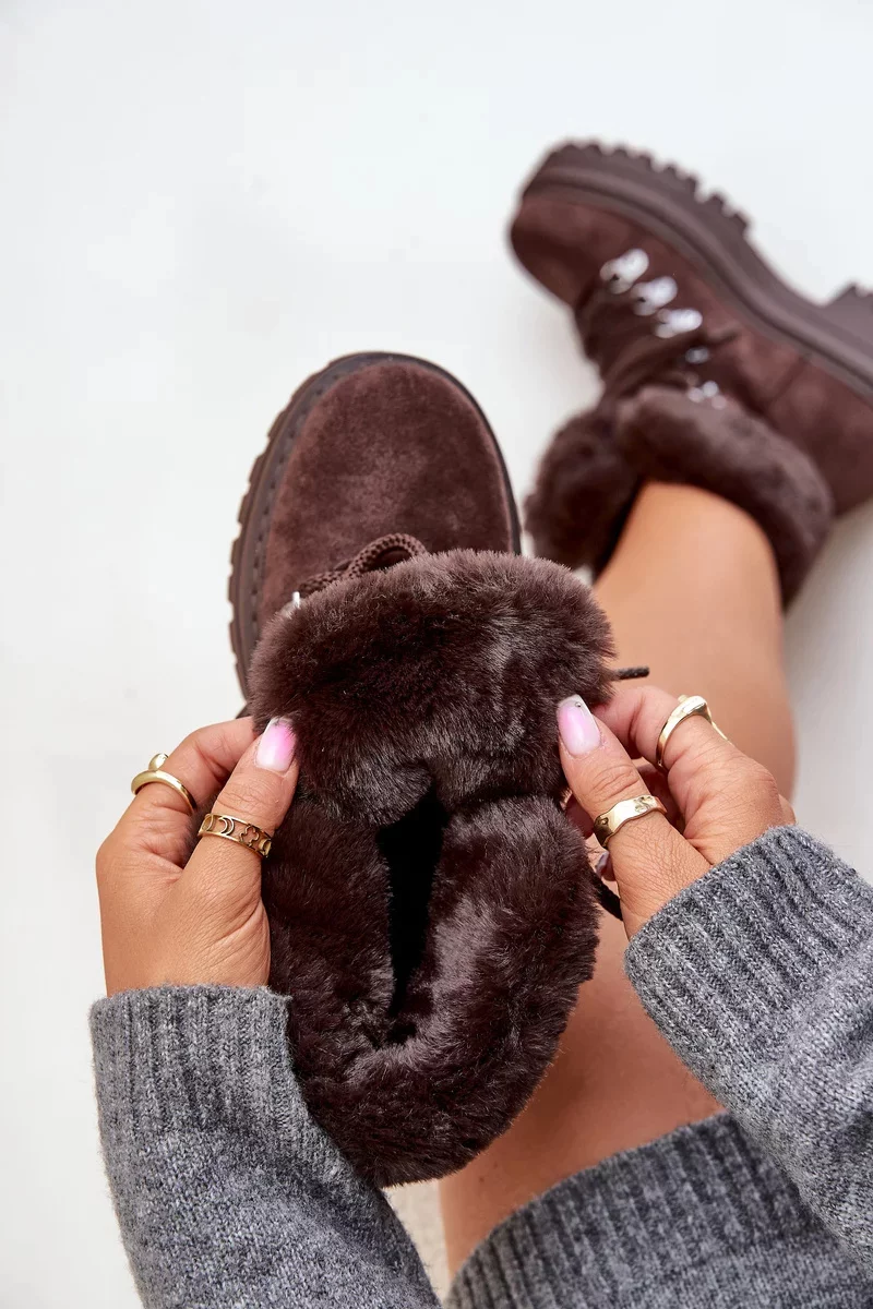 Dámské trapery vyrobené z eko semiše jsou skvělou volbou na chladné dny. Šněrování umožňuje přesné přizpůsobení boty k noze, zajišťující pohodlí při každodenním používání. Vnitřek zateplený obuvnickou dekou zaručuje teplo a pohodlí i v mrazivých dnech. Horní část svršku byla ozdobena měkkým kožíškem, který nejen dodává styl, ale také chrání před chladem. Tyto trapery spojují funkčnost a módní vzhled, ideálně se hodí jak pro městské stylizace, tak pro zimní procházky. Při výběru velikosti se prosím řiďte tabulkou velikostí.