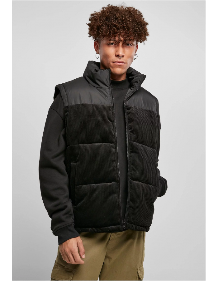 Tato pánská vesta kombinuje dva kontrastní materiály – manšestr a polyester – s hřejivou výplní, která vytváří jedinečný kousek městské módy. Jasně vyčnívají ramena a oblast stojáčku z polyesteru. Vesta nabízí další boční kapsy se skrytým zipem a je také na zip. Šikovným detailem je vnitřní kapsa. Pánská vesta je volného střihu a je extrémně pohodlná na nošení.