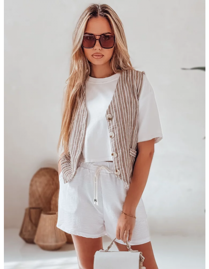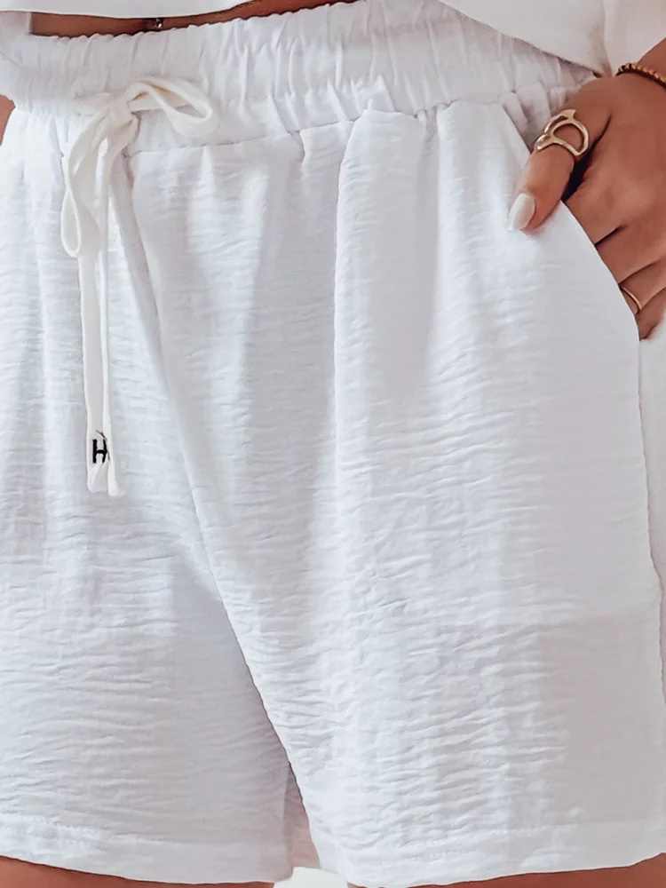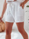 Damskie spodenki materiałowe o luźnym kroju i wysokim stanie to doskonała baza do tworzenia letnich stylizacji. Dzięki elastycznej gumce w pasie oraz troczkom z ozdobnymi końcówkami, świetnie dopasowują się do sylwetki. Dwie kieszenie z przodu dodają im casualowego charakteru. Wykonane z lekkiej tkaniny, sprawdzą się zarówno podczas spacerów po plaży, jak i w miejskim klimacie.