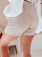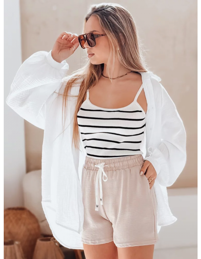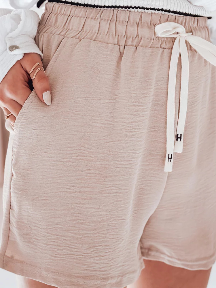 Damskie spodenki materiałowe o luźnym kroju i wysokim stanie to doskonała baza do tworzenia letnich stylizacji. Dzięki elastycznej gumce w pasie oraz troczkom z ozdobnymi końcówkami, świetnie dopasowują się do sylwetki. Dwie kieszenie z przodu dodają im casualowego charakteru. Wykonane z lekkiej tkaniny, sprawdzą się zarówno podczas spacerów po plaży, jak i w miejskim klimacie.