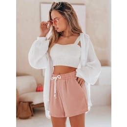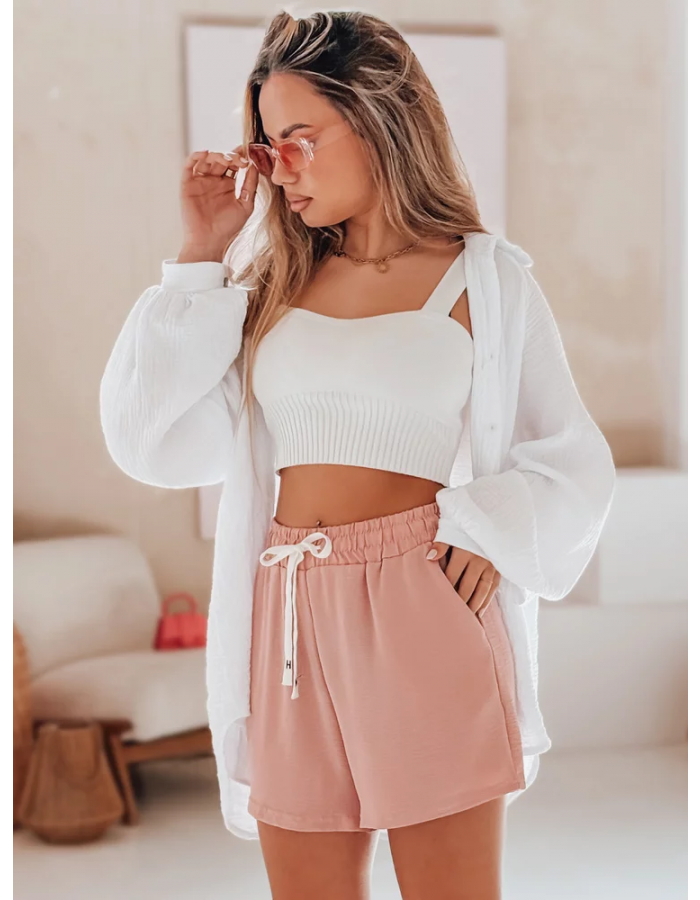 Damskie spodenki materiałowe o luźnym kroju i wysokim stanie to doskonała baza do tworzenia letnich stylizacji. Dzięki elastycznej gumce w pasie oraz troczkom z ozdobnymi końcówkami, świetnie dopasowują się do sylwetki. Dwie kieszenie z przodu dodają im casualowego charakteru. Wykonane z lekkiej tkaniny, sprawdzą się zarówno podczas spacerów po plaży, jak i w miejskim klimacie.