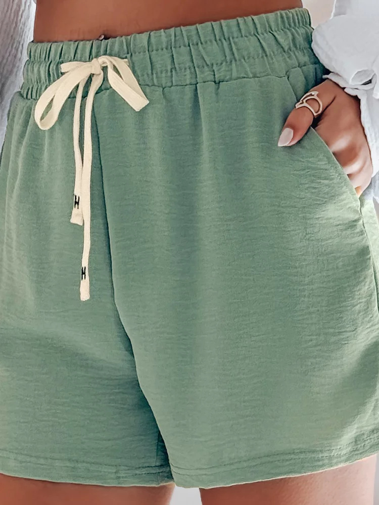 Damskie spodenki materiałowe o luźnym kroju i wysokim stanie to doskonała baza do tworzenia letnich stylizacji. Dzięki elastycznej gumce w pasie oraz troczkom z ozdobnymi końcówkami, świetnie dopasowują się do sylwetki. Dwie kieszenie z przodu dodają im casualowego charakteru. Wykonane z lekkiej tkaniny, sprawdzą się zarówno podczas spacerów po plaży, jak i w miejskim klimacie.