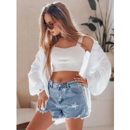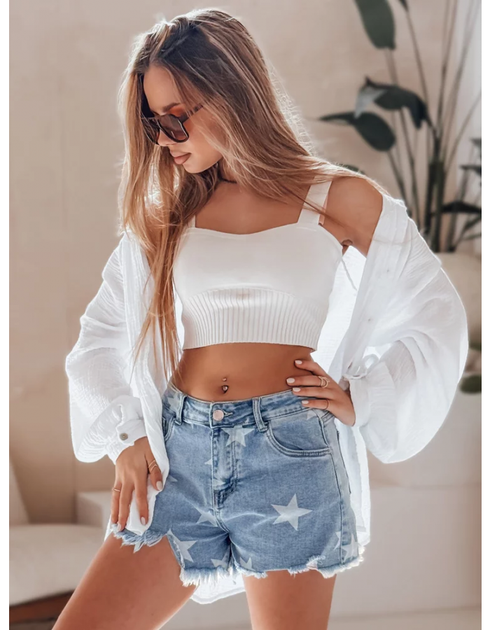 Damskie spodenki jeansowe z wysokim stanem to letni hit, który łączy wygodę i modny design. Model zachwyca nadrukiem w postaci kontrastowych gwiazdek rozmieszczonych na całej powierzchni, dzięki czemu stylizacja zyskuje wyjątkowy charakter. Zapinane na guzik i zamek, posiadają ozdobne kieszenie oraz efektowne postrzępione nogawki, które dodają całości luzu. Idealne na lato, plażę i spacery w słońcu.