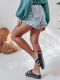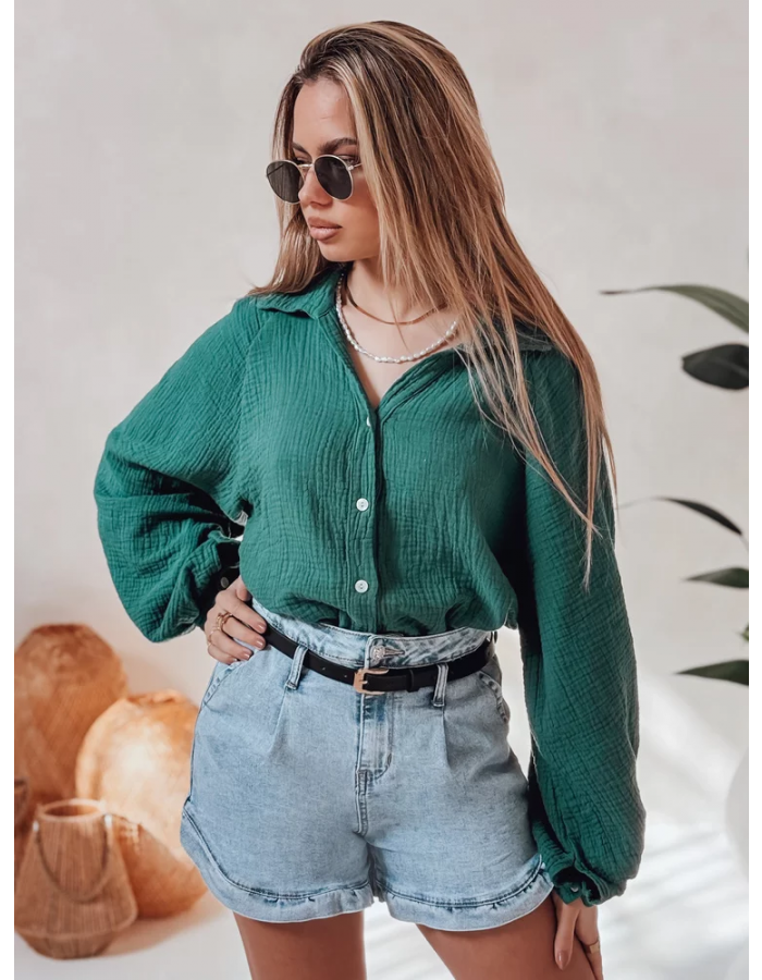 Damskie spodenki jeansowe o wysokim stanie, zapinane na klasyczny guzik i zamek, z uroczym wykończeniem nogawek w postaci subtelnej falbanki. Model wyposażony w ozdobne kieszenie z przodu i z tyłu oraz stylowy pasek w zestawie, który podkreśla talię. Idealne na wiosenne i letnie dni – sprawdzą się zarówno w miejskich, jak i wakacyjnych stylizacjach.