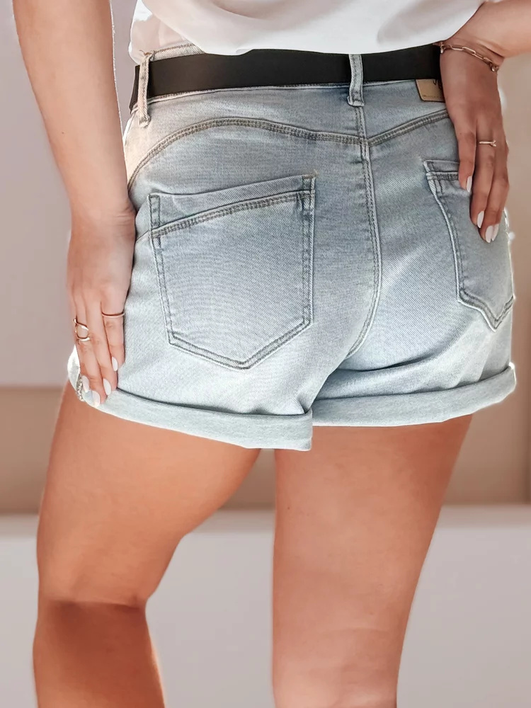Spodenki damskie wykonane z miękkiego, lekko spranego jeansu wyróżniają się luźnym krojem oraz stylowymi detalami w postaci przetarć i dziur, które podkreślają miejski styl. Średni stan optycznie wydłuża nogi, a ozdobne kieszenie dodają uroku. Dołączony pasek z klamrą w kształcie motyla to modny akcent, który przyciąga spojrzenia. Idealne do codziennych stylizacji w ciepłe dni.