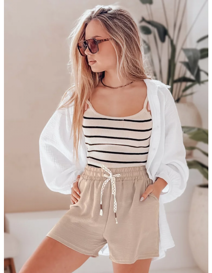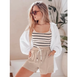 Spodenki damskie z materiału o delikatnej fakturze zachwycają prostotą i wakacyjnym klimatem. Wysoki stan oraz elastyczny pas gwarantują wygodę, a ozdobny sznurek dodaje całości oryginalnego charakteru. Uniwersalny fason świetnie komponuje się z topami, koszulami i sandałami. To model, który z łatwością można dopasować do codziennych stylizacji na lato.