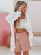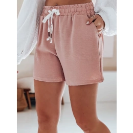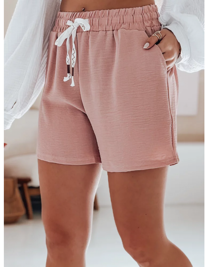 Spodenki damskie z materiału o delikatnej fakturze zachwycają prostotą i wakacyjnym klimatem. Wysoki stan oraz elastyczny pas gwarantują wygodę, a ozdobny sznurek dodaje całości oryginalnego charakteru. Uniwersalny fason świetnie komponuje się z topami, koszulami i sandałami. To model, który z łatwością można dopasować do codziennych stylizacji na lato.