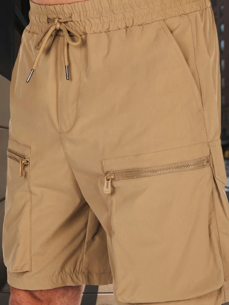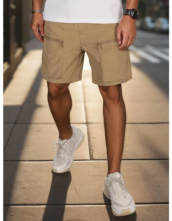 Męskie spodenki bojówki z elastycznym pasem i troczkiem zapewniają wygodę podczas codziennych aktywności. Wykonane z przyjemnego w dotyku materiału, oferują swobodę ruchów. Dwie kieszenie z przodu, dwie boczne oraz dwie z tyłu, w tym zapinane na zamek. Idealne na wiosenne, jak i letnie dni.
