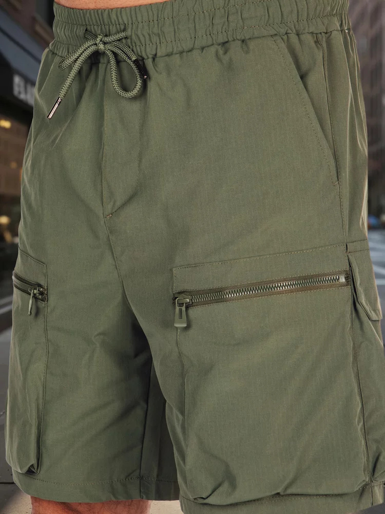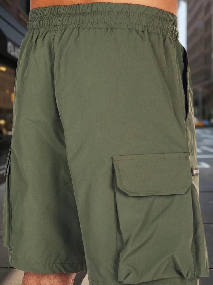 Męskie spodenki bojówki z elastycznym pasem i troczkiem zapewniają wygodę podczas codziennych aktywności. Wykonane z przyjemnego w dotyku materiału, oferują swobodę ruchów. Dwie kieszenie z przodu, dwie boczne oraz dwie z tyłu, w tym zapinane na zamek. Idealne na wiosenne, jak i letnie dni.