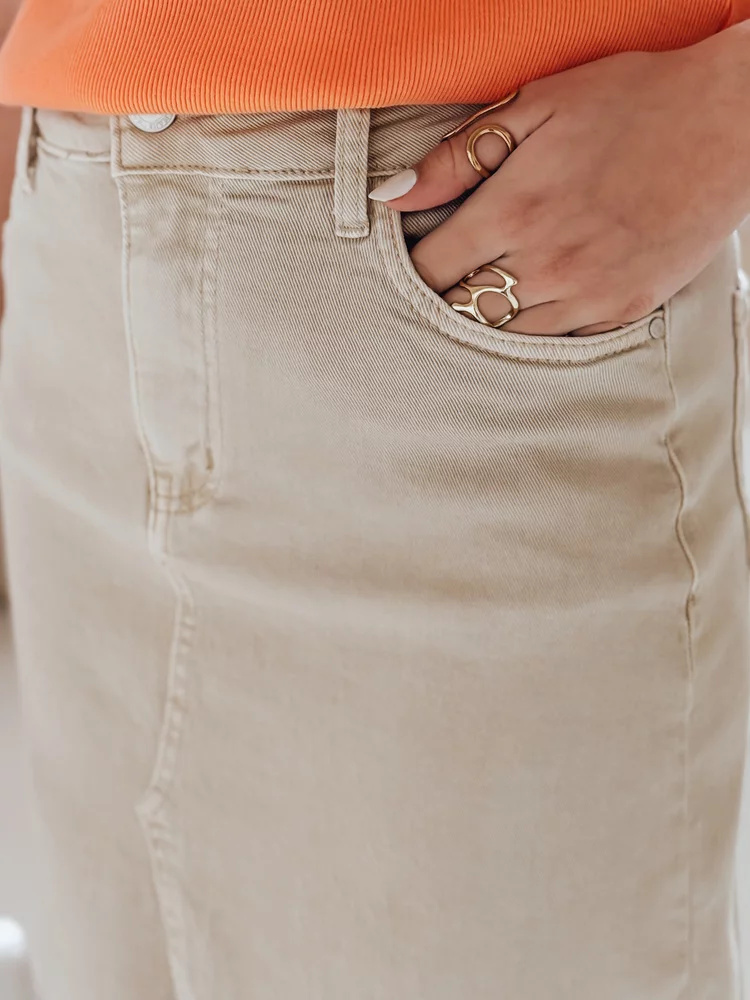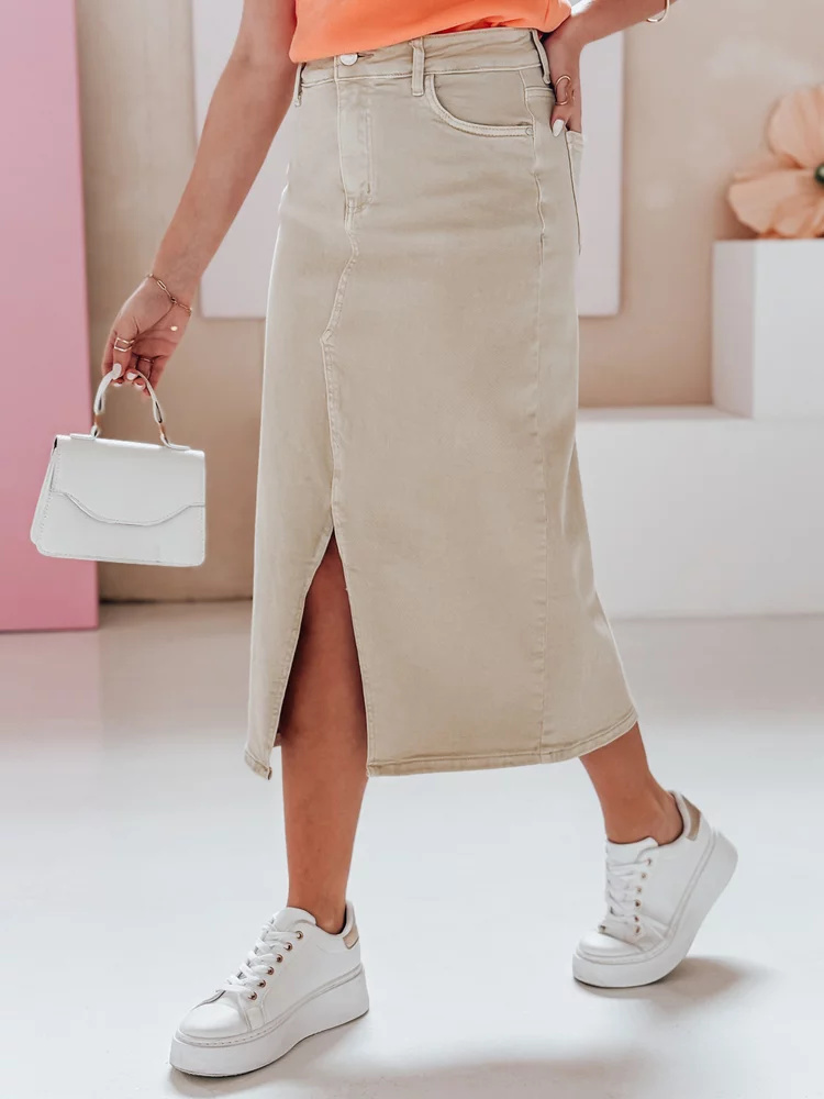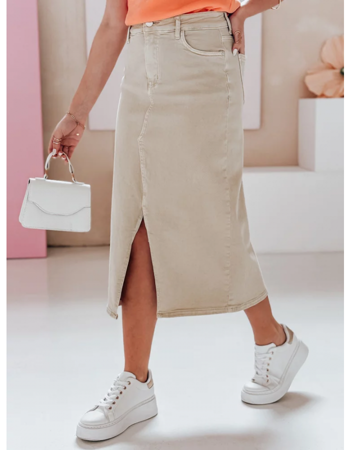 Jeansowa spódnica maxi z wysokim stanem to połączenie wygody oraz ponadczasowego stylu. Zapinana na guzik i zamek, posiada klasyczne kieszenie, jak i szlufki na pasek. Obcisła w górnej części pięknie podkreśla kobiecą sylwetkę, a efektowne rozcięcie z przodu nadaje całości lekkości. Idealna na wiosnę – pasuje zarówno do sportowych, jak i casualowych stylizacji.
