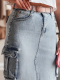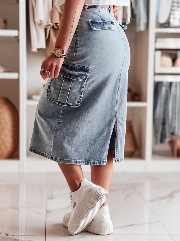 Spódnica jeansowa midi o modnym kroju cargo, idealna dla miłośniczek casualowego stylu. Wyposażona w duże ozdobne kieszenie po bokach i subtelne przeszycia, które dodają jej oryginalnego charakteru. Wysoki stan podkreśla sylwetkę oraz optycznie wydłuża nogi, a delikatne rozcięcie z tyłu zapewnia wygodę noszenia. Idealna na co dzień, świetnie komponuje się zarówno z trampkami, jak i eleganckimi botkami.